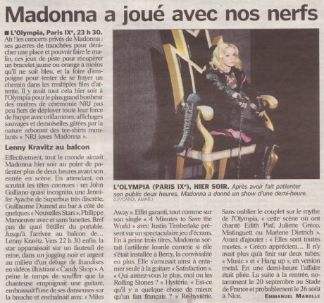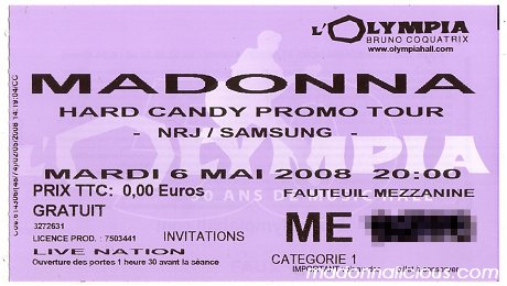 Para el mes de Mayo, Madonna se presentaría en Francia, en el mítico teatro «Olympia Paris» de la ciudad luz, (repetiría la fórmula cuatro años despúes para un show especial del «MDNA Tour» en 2012). Junto con los ganadores de la competencia de ICON y NRJ, se regalaron 500 boletos en la puerta el día del espectáculo. Antes del show, el personal de promoción de NRJ repartió piruletas y dulces a los cientos de fanáticos que esperaban impacientemente. Este show no fue filmado ni transmitido profesionalmente de manera que solo tenemos algunas imágenes tomadas por fans.