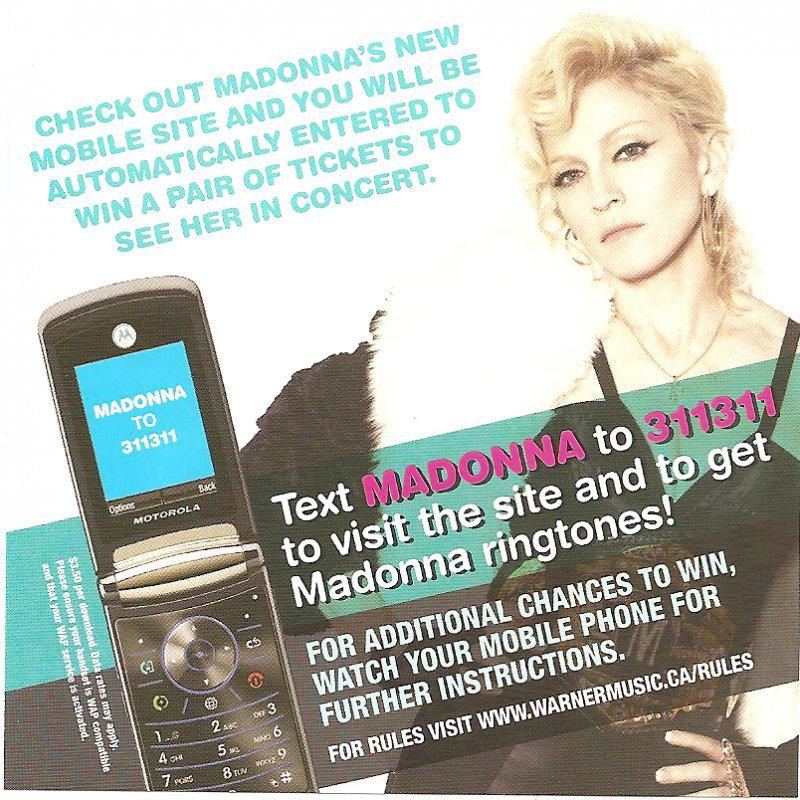 - Madonna y Warner firmaron contrato con dos empresas de teléfonos celulares y la compañía Vodafone en Europa para la promoción anticipada del disco. Siete canciones del álbum, «Candy Shop», «Miles Away», «Give It 2 Me», «Heartbeat», «Beat Goes On», «Devil Wouldn’t Recognize You» y «She’s Not Me», además del video de «4 Minutes» estuvieron disponibles para su descarga por teléfono móvil en el modelo F400 de Samsung durante la semana anterior al lanzamiento oficial desde el 21 hasta el 27 de abril de 2008. Con Sony Ericsson, sucedió algo similar, ofreciendo el álbum precargado en sus teléfonos en 27 países de todo el mundo.