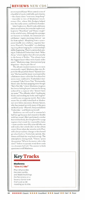 - En diciembre de 2007, Liz Rosemberg organiza una fiesta especial para escuchar el disco con unos 30 ejecutivos de la Warner en las oficinas centrales de Manhattan. Madonna llega acompañada de Ingrid Casares. A pesar de que no se tenía el título del disco, la temática del mismo se basaría en «Candy Shop», de manera que el lugar estaba todo decorado como una tienda de dulces, con caramelos gigantes, paletas y todo tipo de golosinas. La propia Madonna fue la encargada de ir diciendo que canción se reproducía y comentó que el título del disco era «Give it 2 Me». Se realizó una votación para decidir cuál sería el primer single, mientras que Madonna quería que fuera «Candy Shop», la mayoría optó por «4 Minutes» (que por entonces se titulaba «4 Minutes to Save the World«). Al parecer Madonna no quedó demasiado complacida con la decisión.