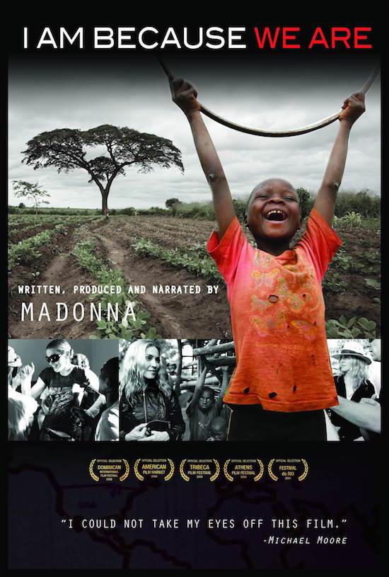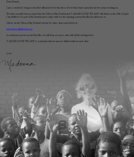 - A comienzos de 2008, Madonna escribió una carta a los miembros de su club de fans ICON contándoles las novedades: «Queridos amigos: estoy muy emocionada de traerles la primera noticia oficial de este trabajo de amor en el que he pasado los últimos dos años trabajando. Recientemente hemos sido aceptados en el Festival de Cine de Tribeca y ‘Yo Soy Porque Somos’ se estrenará el 24 de abril. Estoy emocionada de ser parte de este festival y de compartir con ustedes el increíble viaje por el que me ha llevado esta película. Visiten el sitio web del Festival de Cine de Tribeca para conocer las fechas, los horarios… A medida que crezca la conciencia sobre esta película, los mantendremos actualizados con todas las noticias emocionantes. ‘Yo Soy Porque Somos’ es un recordatorio de que no estamos definidos el uno sin el otro… Con amor, Madonna».