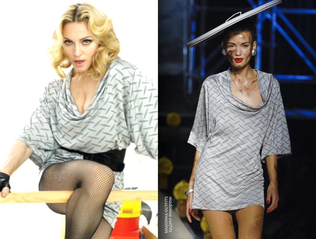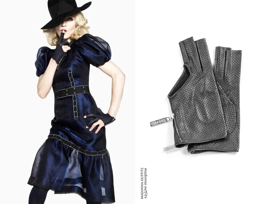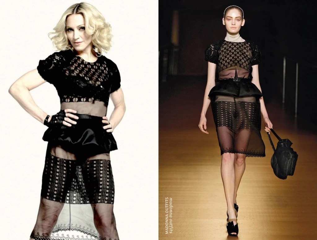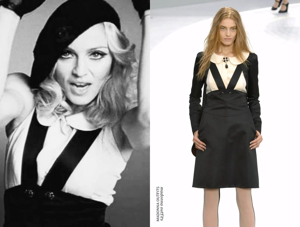- Vestido de seda negro con mangas largas y abullonadas en los puños y detalles de múltples cadenas doradas de la colección otoño-invierno 2008 de «Givenchi» (este mismo vestido fue usado por Madonna anteriormente durante la promoción del disco «Hard Candy»).