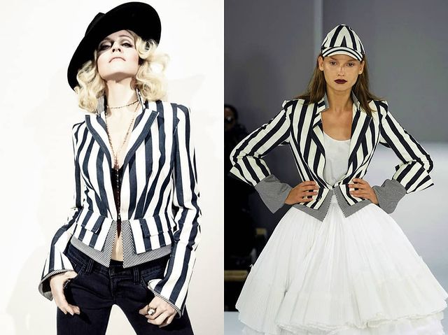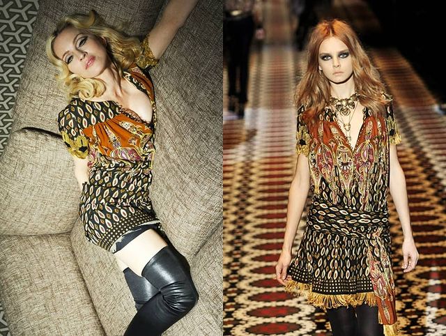 - Vestido en gasa estampada modelo «tribal» con faja en la cintura de la colección otoño-invierno 2008 de «Gucci» (Madonna habría usado este vestido para el estreno de su documental «I Am Because We Are» en el «Tribeca Film Festival» en abril 2008)