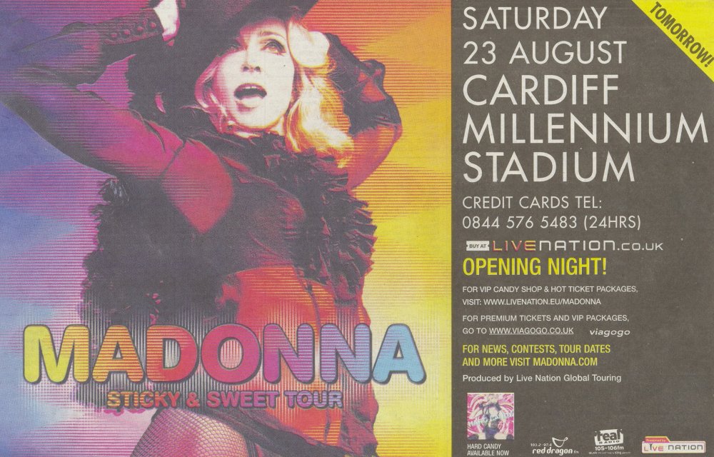El 23 de agosto Madonna abre su nueva gira en el «Millenium Stadium» de la ciudad de Gales con un lleno total con 33.460 personas. Paul Oakenlfond fue el encargado de preparar el show. En su única presentación en la ciudad, Madonna se mostró bastante confiada en su primera noche aunque tuvo poca interacción con el público. En el pedido de canción hacia el final del show, cantó unos pocos versos de «Express Yourself».