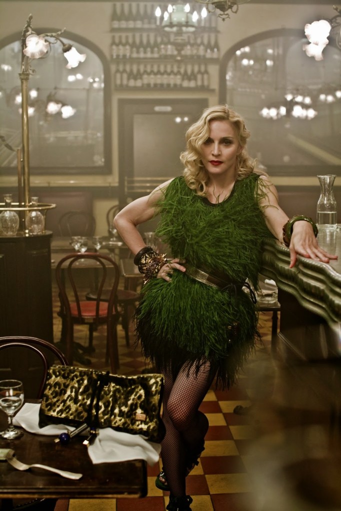 En las fotos, Madonna lució tres conjuntos principales, un vestido corto realizado enteramente con plumas y flecos verdes (vestido que también usó durante el evento de la cena benéfica de «Gucci», probablemente el mismo día de esta sesión de fotos); un vestido de dos piezas con top en color chocolate y minifalda en plumas naranjas y un conjunto de chaqueta sin mangas escotada y pantalón de seda a lunares estilo pijama. Se completó los looks con las sandalías con incrustaciones y apliques étinos y los bolsos de la nueva colección.