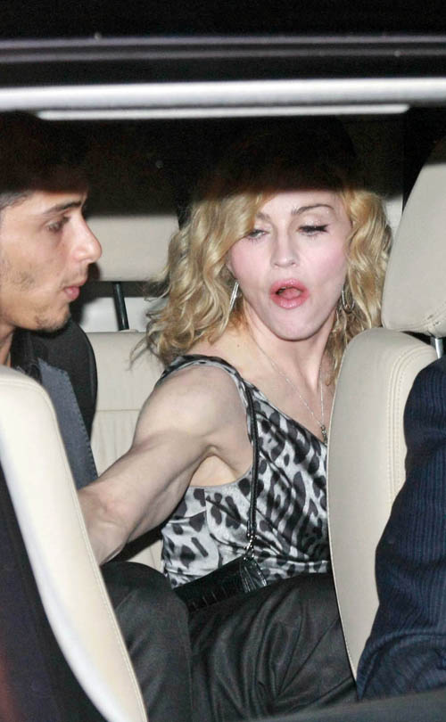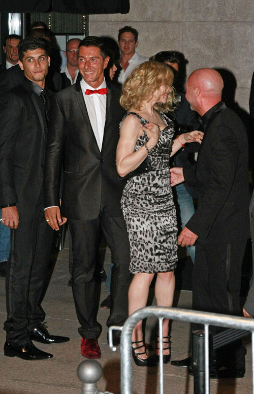 En medio de las actuaciones de la segunda parte de su gira «The Sticky and Sweet Tour», Madonna decidió tomarse un momento y participar de la exclusiva fiesta que el duo de diseñadores Domenico Dolce y Stefano Gabbana realizaron en un exclusivo restorán de la ciudad de Milán y de paso celebrar el acuerdo para la realziación de una nueva campaña publicitaria para el año próximo. Madonna, quien se encontraba en el país para las presentaciones de su tour en Milán, el 14 de Julio y en Udine, el 16, se tomó una noche libre para salir a festejar junto a su nuevo novio, el modelo brasilero Jesús Luz. Madonna lució de muy buen humor y complacida saludando a los cientos de paparazzis que se agolparon en la puerta del lugar. La Reina del Pop se mostró con el cabello suelto y ondulado y estrenando la última prenda de la nueva colección de la firma italiana: un vestido corto sin mangas de seda en un estampado animal print en blanco y negro muy ajustado al cuerpo.