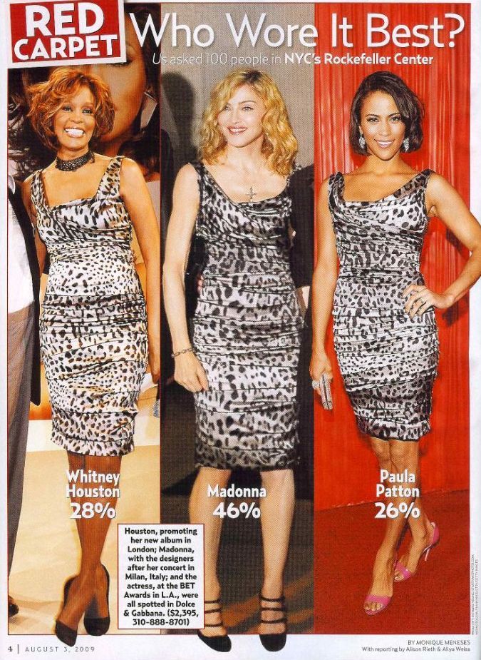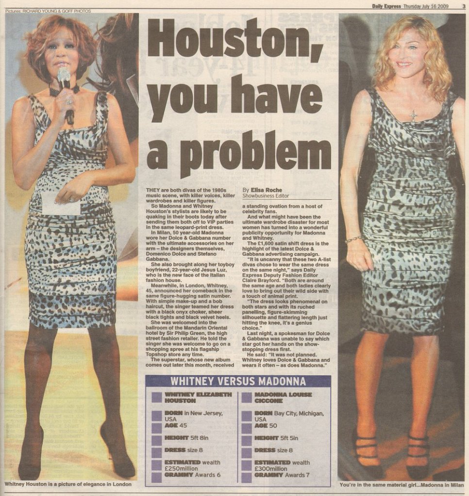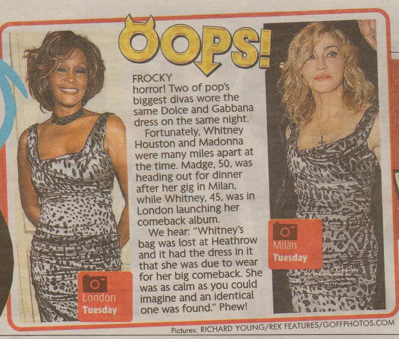 Sin embargo, algo esa noche llamó la atención de toda la prensa y fue que justamente, al otro lado de Europa, en Londres, otra diva de la música Whitney Houston se encontraba en un evento público luciendo exactamente el mismo vestido. Houston se encontraban lanzando su último disco «Look To You» en «The Mandarin Oriental Hotel» en Knightsbridge. Inmediatamente, no faltaron las comparaciones entre las grandes divas de la música y la especulación sobre quién lucía mejor la prenda. Días más tarde, el mismo vestido fue visto en la actriz Paula Patton en Los Angeles. Al parecer la prenda era demasiado buscada por las celebridades.