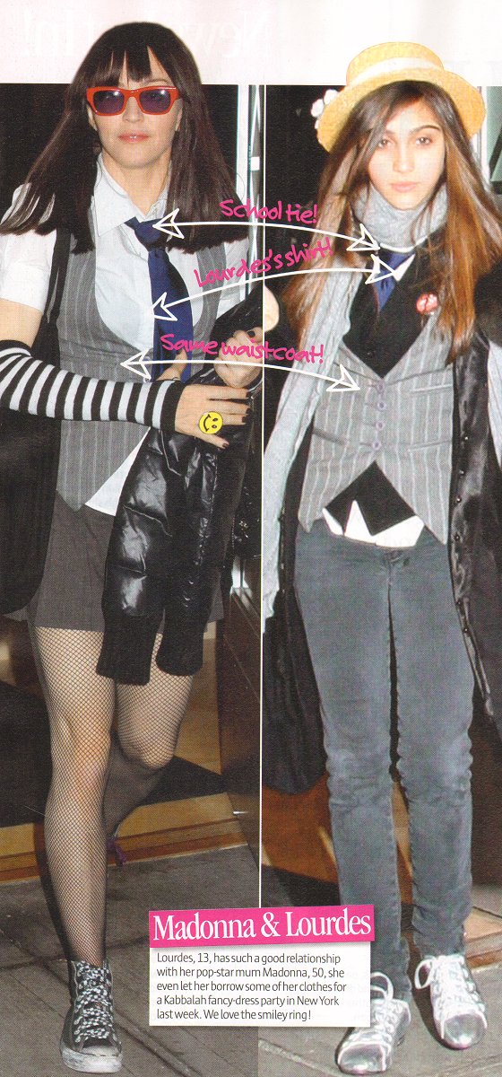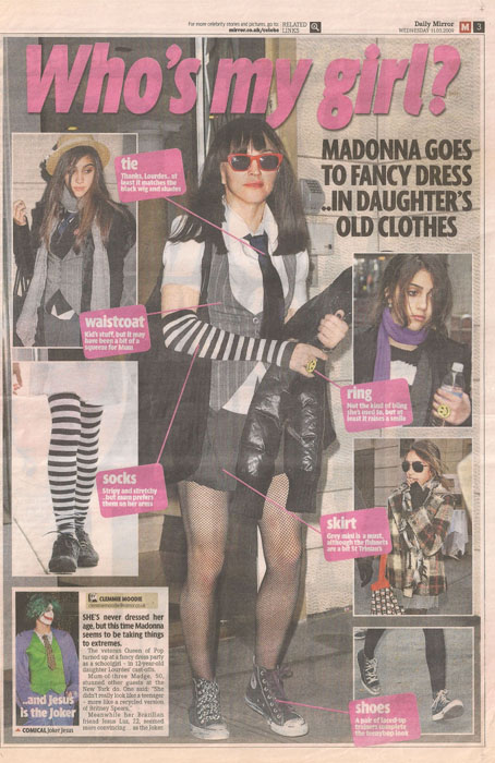 Se realizaron varias comparativas de fotos de Madonna y Lourdes y podemos observar como la joven aportó para la causa donando gran parte de sus prendas y accesorios para la celebración de la madre: la falda, el chaleco, el anillo, los guantes (que eran medias) y hasta las zapatillas fueron prestadas por Lola a la Reina del Pop. Por otro lado, un casi inadvertido e irreconocible Jesus Luz (nuevo novio de Madonna) sorprendió a todos disfrazado del «Joker«. Esta chica sí que sabe divertirse.