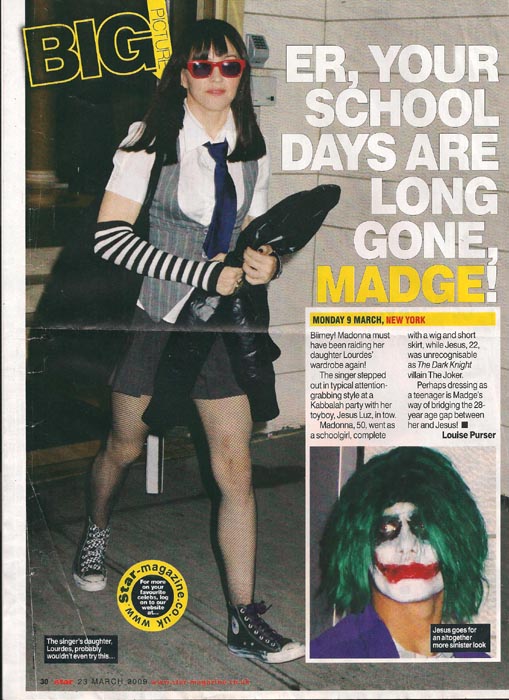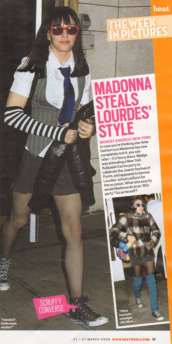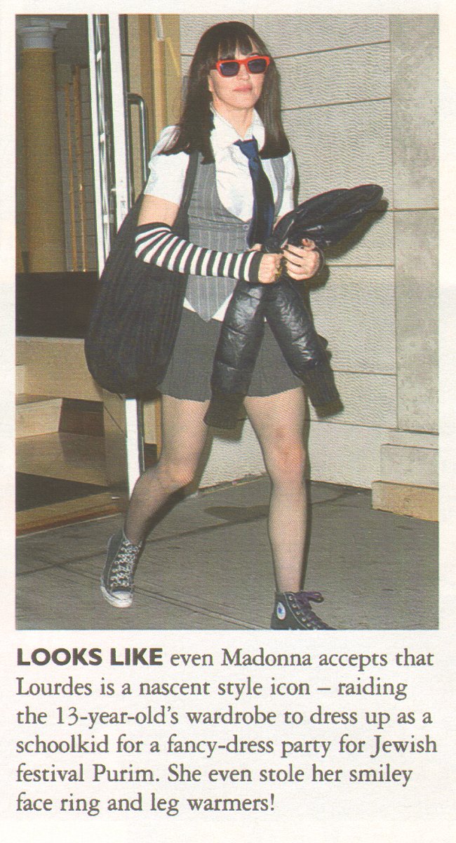 Para esta fiesta, llevada a cabo el 09 de marzo en el «Kabbalah Center» de Manhattan, Madonna adoptó un atuendo de «colegiala» pero una muy particular. Tal vez tomando como inspiración a su hija mayor, Lourdes de 13 años, la cantante lució minifaldas, zapatillas, camisa y corbata, todo acompañado de una peluca de cabello liso negro y gafas con marco colorado. Muchos medios de comunicación se hicieron eco del estilo de Madonna y no dudaron en compararla con su hija adolescente, de hecho, se tomaron el trabajo de descubrir que gran parte de las prendas que Madonna había usado en su disfraz, pertenecen verdaderamente al guardarropas de Lourdes.