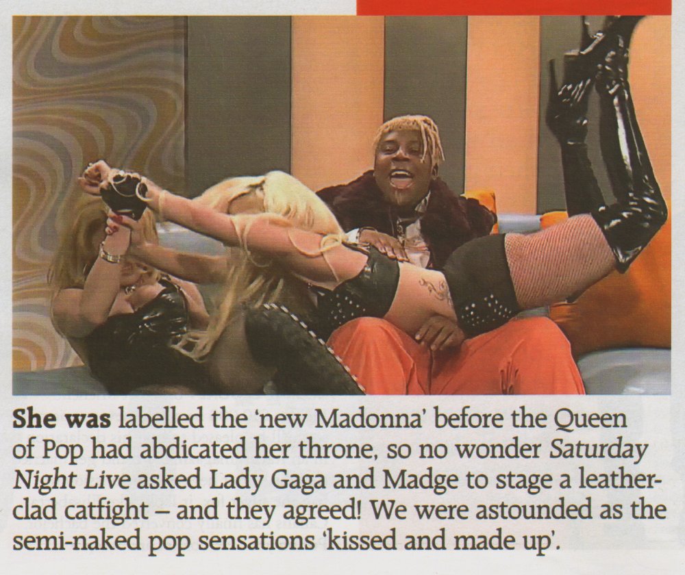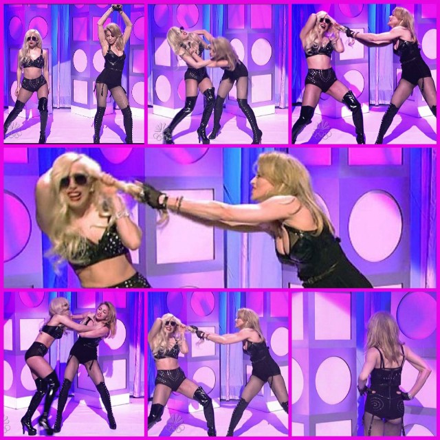 Las dos divas del pop, vestidas con lencería negra a juego y botas hasta la rodilla, realizaron un baile sincronizado y cantaron algunos versos los que simulaban una pelea entre ellas; acto que se detuvo cuando Madonna comenzó a tirar de la peluca de Gaga y a estrangularla iniciando una verdadera «cat fight», gritando: «¿Qué diablos es un palo de discoteca?», refiriéndose al éxito de la estrella más joven; a lo que está respondió rápidamente: «Creo que eso tú ya lo sabes». La pareja enemistada fue separada por el presentador del programa y llevadas a un sillón para apaciguar la pelea, pero entonces se produjo una guerra de palabras cómicas cuando Gaga, la invitada musical del programa, susurró: «Adivina, Madonna, soy totalmente más sexy que tú», a lo que Madonna respondió: «Oye, adivina qué, soy más alta que tú… ¿Qué clase de nombre es Lady Gaga; ¡suena como comida para bebés!». La pareja pop continuó con la batalla hasta que Kenan las obligó a hacer las paces y darse un beso, el cual terminó siendo para él.