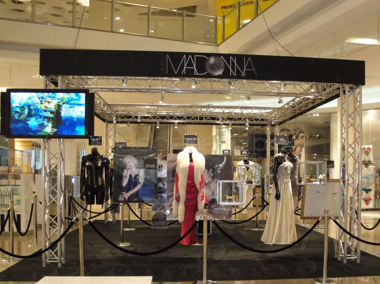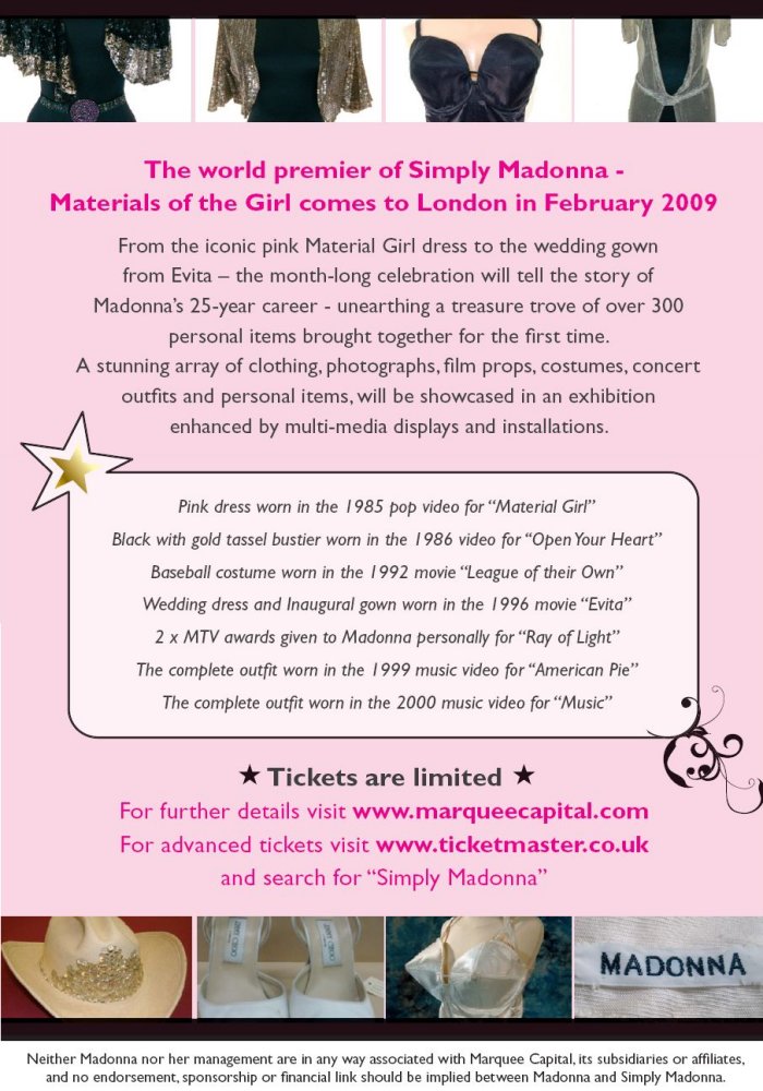 La ciudad de Londres vió por primera vez esta extensa colección de elementos personales y vestuario icónico de la Reina del Pop y que más tarde recorrería el mundo hasta el 2012. Esta muestra titulada “Simply Madonna: Materials of the Girl” fue realizada en la galería “Old Truman Bewery” de Londres desde el 21 de febrero al 22 de marzo del 2009. En la muestra se exhibían varios artículos muy representativos de la carrera de Madonna como el vestido del video “Material Girl”, un traje del film “A League of Their Own”, dos vestidos del film “Evita”, eñ bustier del clip «Open Your Heart», algunos premios y objetos personales entre los que completaban más de 300 artículos, además de posters, flyers, discos y mucho material de memorabiblia.