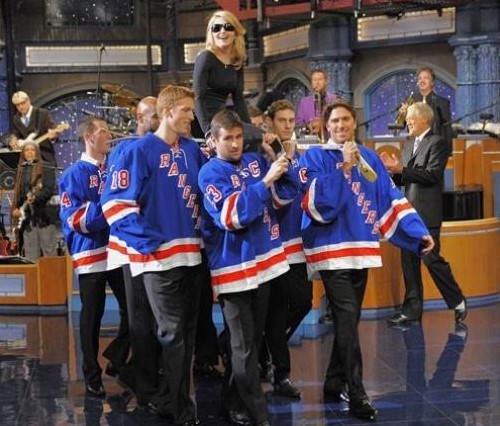 La Reina del Pop ingresó al estudio de una manera muy particular, superando así la última vez que había participado del programa en 2005 en donde se la vio montar a caballo luego de su gran caída cabalgando. Esta vez, Madonna fue ingresada al set llevada en andas por el equipo de hockey masculino «The Rangers» quienes estaban también invitados al show.