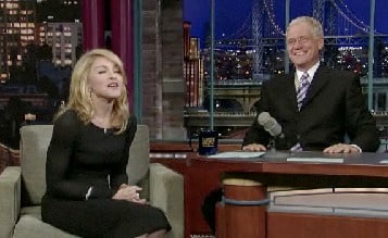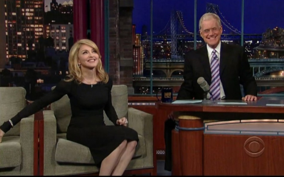 Durante la entrevista que duró aproximadamente 15 minutos, Madonna se mostró de buen humor y habló de todo: de su apodo «Madge» en Londres y de cómo odia que la llamen así, de su separación con Guy Ritchie y recordó las veces que estuvo en el programa luego de que Letterman le preguntara «¿Yo te gusto?» a lo que ella respondió: «Bueno… estuve en tu programa ocho veces…». Cuando Letterman mostró una fotografía de su hija Lourdes en el set del video «Celebration», Madonna bromeó diciendo que era ella luego de salir del spa.