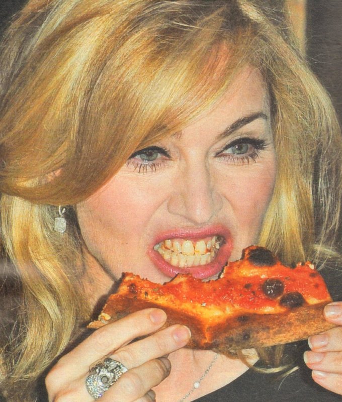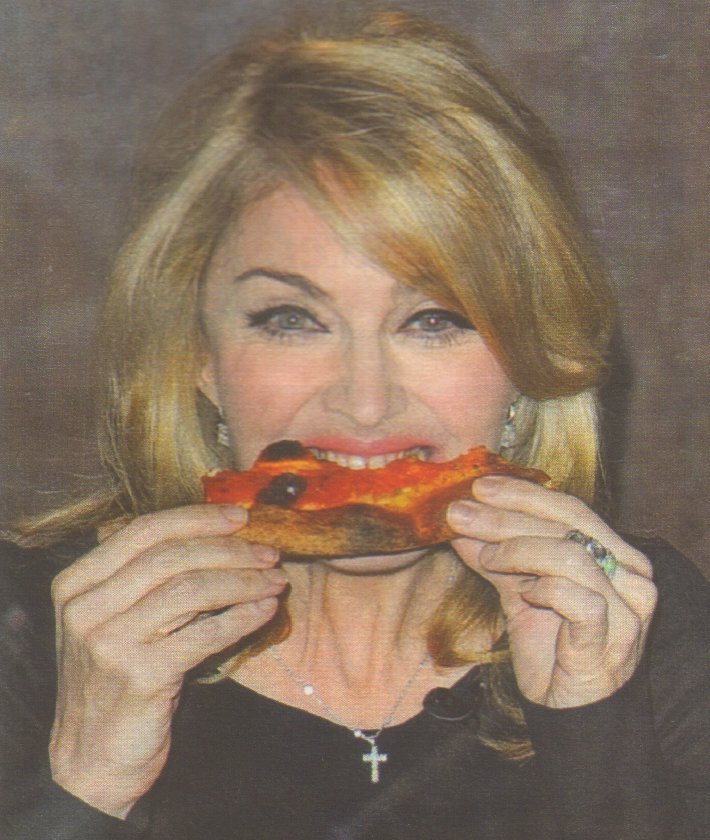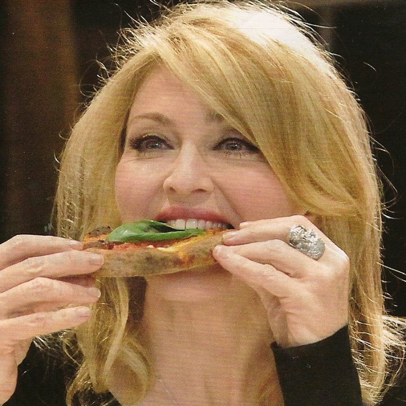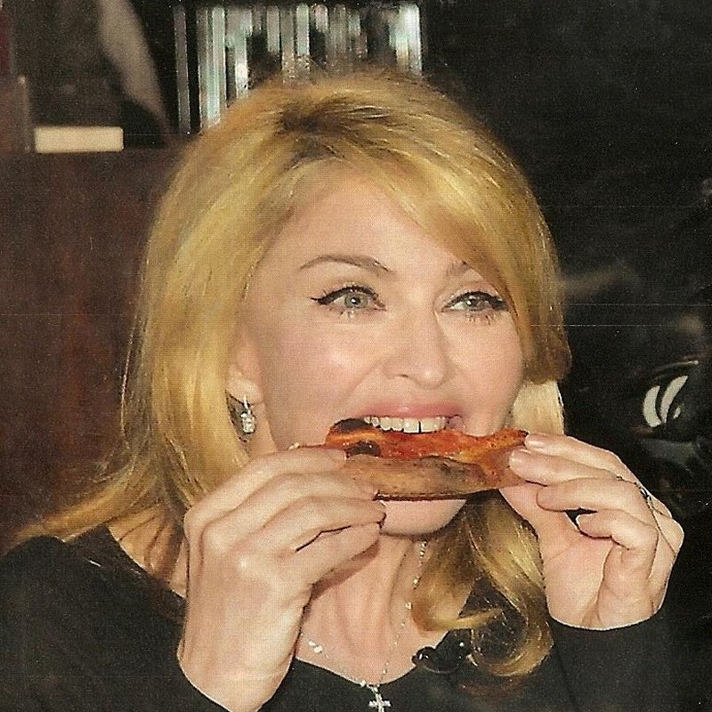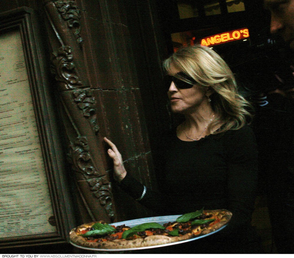 Lo que no se vio: al finalizar la entrevista (y la única porción de piza que Madonna probó) la diva salió a la calle con el resto de la comida para dársela a la gente que se había agolpado afuera del local.