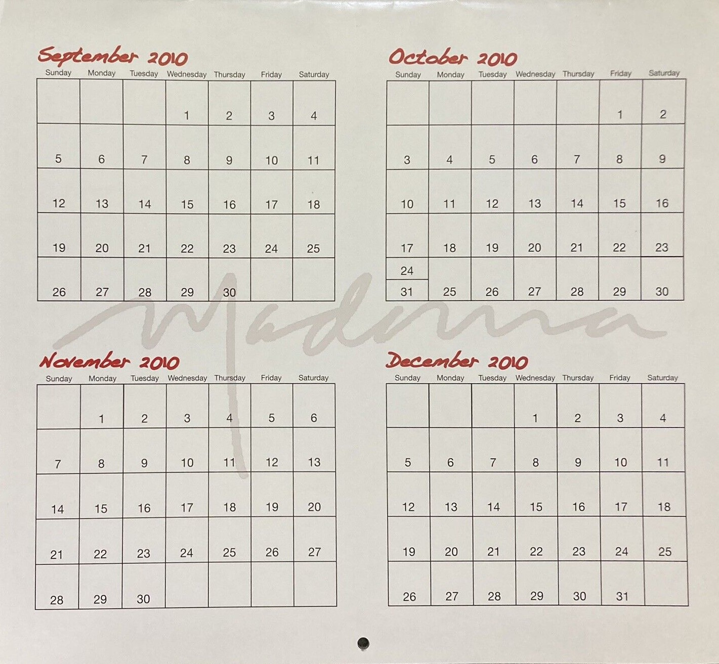 En el segmento memorabiblia de cada año, comenzamos como siempre con el calendario oficial 2011. La edición de Signature Networks y Boy Toy Inc. para USA consiste en un formato cuadrado de 12″ x 12″ que se abre a modo de libro con la fotografías en la parte superior del mismo e incluye una fotografía adicional; mientras que la versión europea estuvo realizada por Danilo Inc. Este calendario en formato rectangular con espiral en la parte superior. Este calendario destaca la última campaña de Madonna para la firma «Dolce & Gabbana» realizada en 2010 con dos fotografías de dicha sesión de fotos tanto para la tapa como contratapa. En el interior, cada mez viene decorado con una fotografía de épocas anteriores a cargo de fotógrafos como Steven Klein, Steven Meisel, Herb Ritts y Peter Lindbergh.