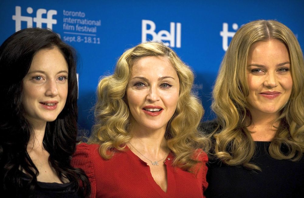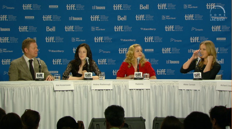 Durante la mañana del 12 de septiembre, Madonna y sus dos actrices principales, Abbie Cornish y Andrea Riseborough, junto con el compositor y director musical del soundtrack del film, Abel Korzeniowsky se hicieron presentes en el «TIFF Bell Lightbox» para dar una conferencia de prensa y presentar oficialmente su film, el que se proyectaría esa misma noche fuera de competencia. Madonna lució un elegante estilo con falda tubo negra, cinturón de cuero y blusa de seda en color rojo furioso, como detalle dentro de todas sus invaluables joyas, se destacó un colgante de oro blanco y diamantes con las letras «WE» haciendo honor a su film.