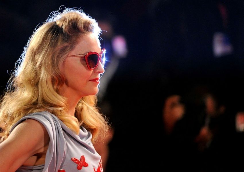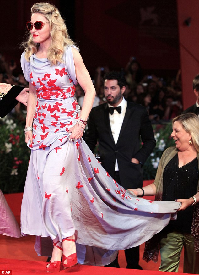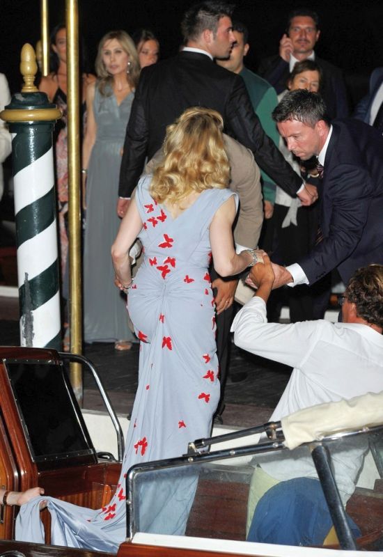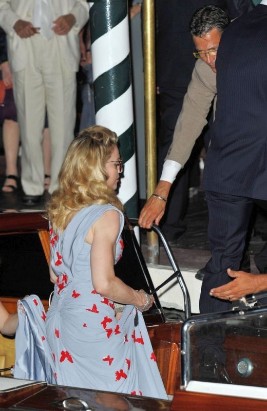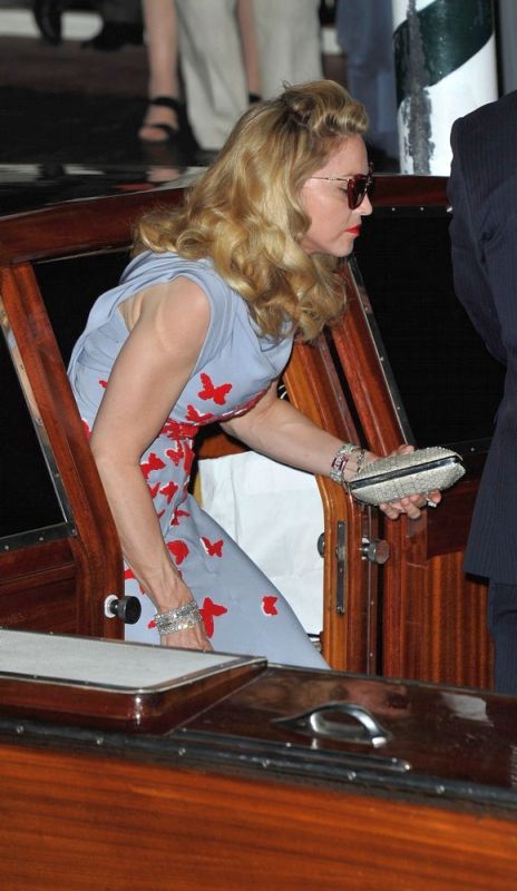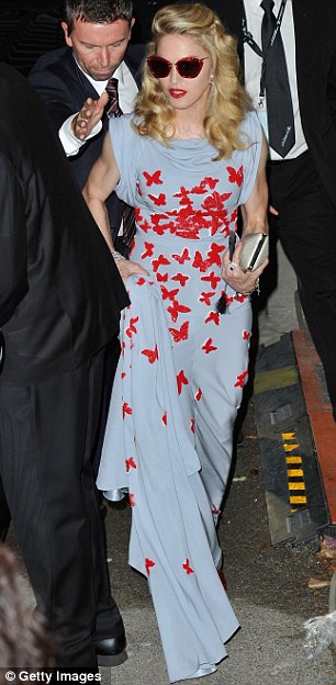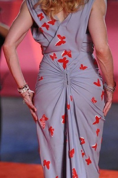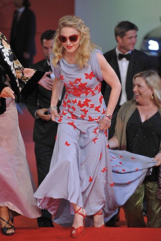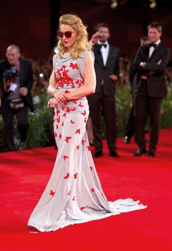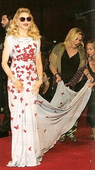 Madonna llegó al final generando una gran expectativa, al bajar de su coche negro, dejó a todos con la boca abierta al mostrarse con un despampanante look al mejor estilo de los años dorados de Hollywood. Peinado con bucles naturales y un rostro más que juvenil, la Reina del Pop se apareció con un impresionante vestido ajustado de seda en color azul-grisáseo con una lluvia de mariposas rojas bordadas y aplicadas sobre su ceñida figura. El vestido sin mangas y con escote abullonado fue una obra creada y diseñada especialmente para ella por el artista italiano Vionnet. La diva completó el look con sandalias con plataforma forradas en seda en color rojo y, a pesar de ser de noche, se enmarcó el rostro con una gafas «Dior» a tono.