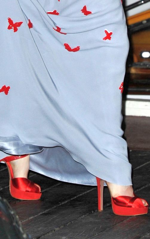 - Sandalias de seda con plataforma roja.