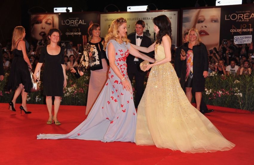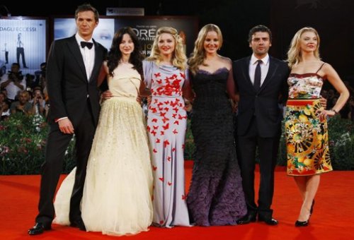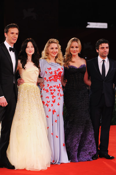 A la alfombra roja del «Palazzo del Cinema» llegaron primero los cuatro protagonistas principales de la película: la actriz australiana Abbie Cornish, que lucía espléndida con un vestido morado sin tirantes en degradé de la firma «Atelier Versace» y la estrella británica Andrea Riseborough, que lucía como una princesa con un «Christian Dior Couture» en color limón, completo con intrincados abalorios en la falda de red de tul. Los protagonistas masculinos, James D’Arcy y Oscar Isaac, se presentaron con elegantes y prolijos esmokins.