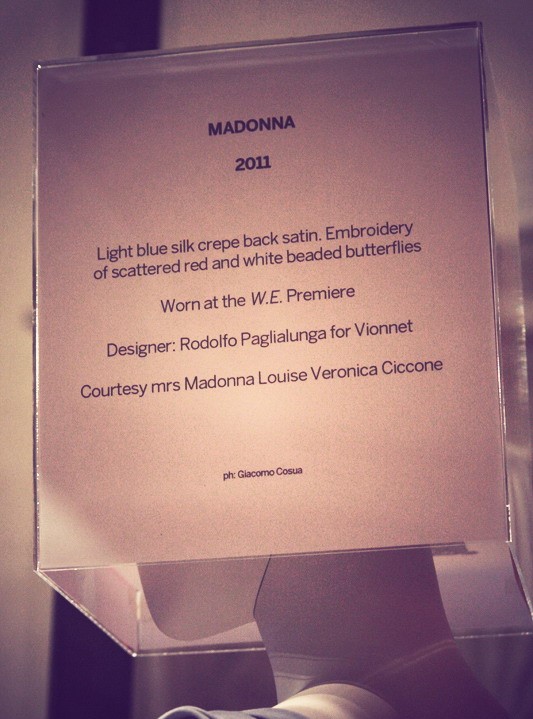 Este fabuloso vestido fue más tarde prestado por Madonna para la realización de una muestra en el «Museo y Centro de Estudios en Palazzo Mocenigo». El evento titulado “Trame di moda – Donne e Stile alla Mostra del Cinema di Venezia” («Cine de Moda – Mujeres y Estilo en el Festival de Cine de Venecia») estuvo organizado por Fabiana Giacomotti y Alessandro Lai, diseñado por Sergio Colantuoni y coordinado por Chiara Squarcina, Directora del museo. En el mismo se mostraban vestidos y obras de diferentes diseñadores que habían sido protagonistas durante la alfombra roja de las diferentes ediciones del «Festival Internacional de Cine de Venecia». El vestido de «Vionnet» prestado por Madonna estuvo expuesto en la muestra desde el 02 de septiembre de 2012 al 06 de enero de 2013.