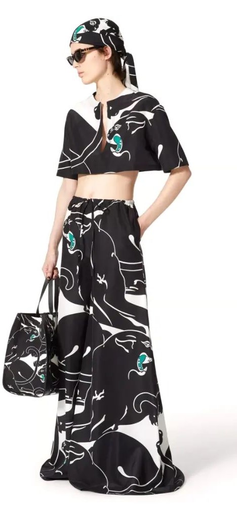 - Conjunto de pantalón ancho y top de poplin negro con detalles en blanco y verde modelo «Panther» de la colección «Escape» verano 2023 de «Maison Valentino».