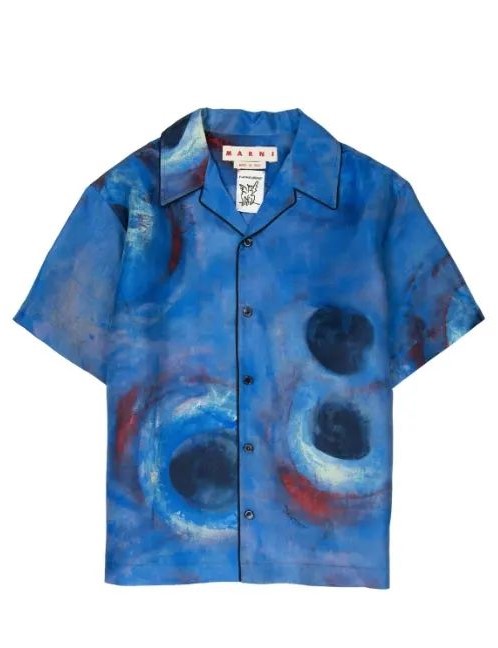Para este día relajado y de pleno sol, Madonna lució un conjunto de camiseta y pantalón ancho en seda en color azul con estampado «Buchi blue» de la artista Flaminia Veronese perteneciente a la colección primavera-verano 2023 de «Marni».