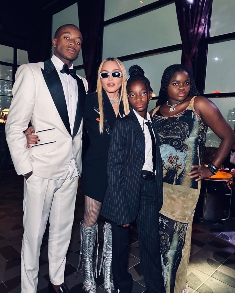 A poco menos de un mes de dar inicio a la ya anticipada «The Celebration Tour», Madonna, su familia y toda su trouppe de bailarines han decidido celebrar el cumpleaños n°18 de David Banda, tercer hijo de la cantante adoptado en Malawi. Como ya sabemos, David es muy unido a su madre y no se despega ni un solo segundo de su lado, además, es un joven bastante divertido que no duda al momento de las fiestas. Fue así, como se decidió a realizar un gran evento en el exclusivo salon «The Fleur Room» de Manhattan. Banda llegó acompañado de su madre luciendo un elegante esmoking blanco mientras que Madonna optó por un atuendo completamente negro con sus gafas de sol infaltables.