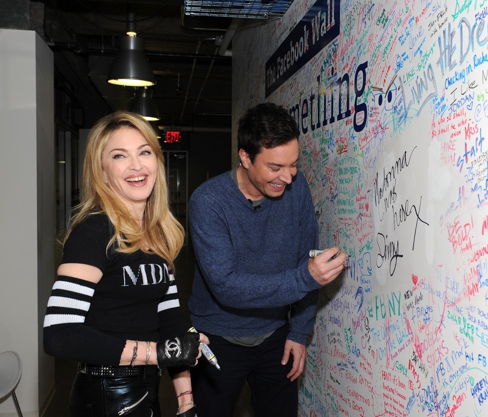 Grabada frente a una audiencia y transmitida en vivo a través de la página de Facebook de Madonna, la entrevista incorporó preguntas enviadas por fanáticos de todo el mundo, así como algunas lecciones de baile para Fallon. Durante el transcurso de la entrevista, Madonna manifestó interés en la física cuántica, dijo que le gustaría hacer un cover de la canción de Serge Gainsbourg, «Je T’Aime Moi Non Plus» y describió cómo las películas de Quentin Tarantino inspiraron su nueva canción «Gang Bang»; «Tengo todo resuelto en la habitación de un motel», dijo, implorando a Tarantino que dirigiera el vídeo. «Todo lo que tiene que hacer es presentarse con una cámara. Y no puedo permitirme los honorarios del director». Un fan preguntó qué haría la reina del pop si fuera presidenta de Estados Unidos, «Bueno, cuando sea presidenta», corrigió Madonna, «primero tomaré todo el dinero gastado en defensa y lo destinaré a educación, para que los maestros reciban más dinero. Es escandaloso lo bajos que son sus salarios. El matrimonio homosexual sería legal en todas partes y aceptado. Nunca habría restricciones de ningún tipo en ninguno de mis videos”. Esa última política quizás se inspiró en la reciente noticia de que YouTube está limitando las vistas del video «Girl Gone Wild» a mayores de 18 años. En respuesta a la sugerencia de Fallon de que una toma del vídeo mostraba a un hombre masturbándose, ella objetó: «No, simplemente se estaba sacudiendo su tanga de látex. Se manchan… ya sabes, la luz detecta todas las huellas dactilares».