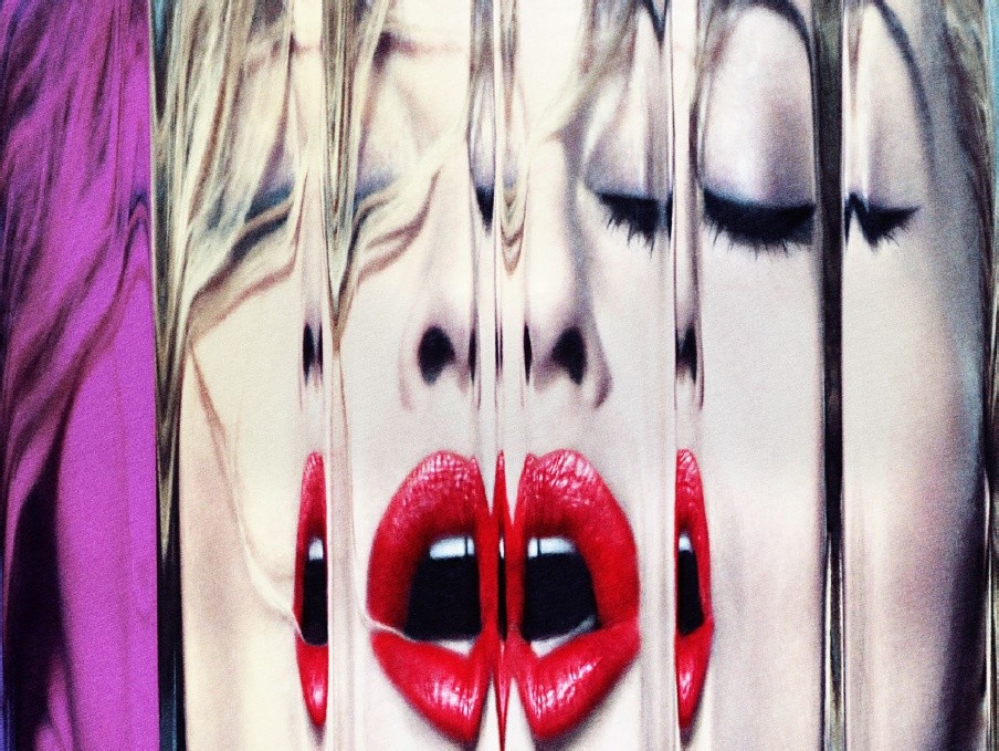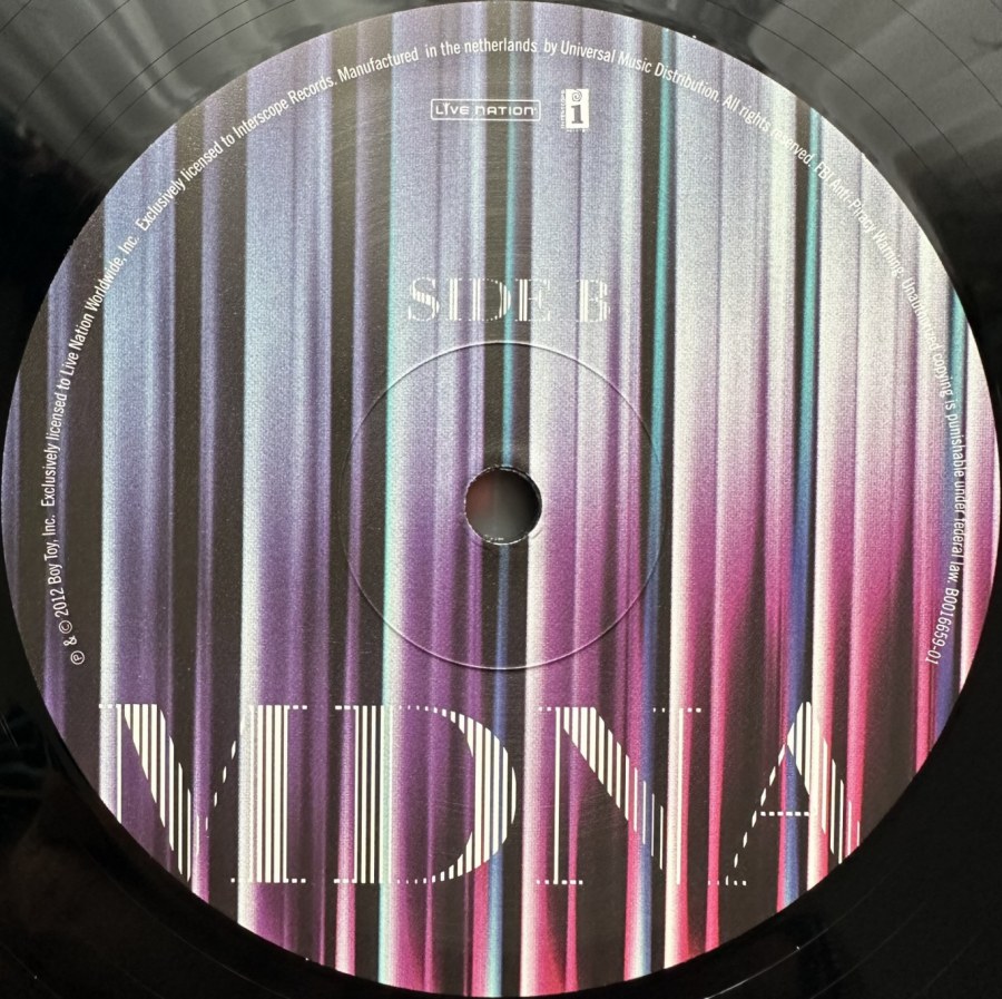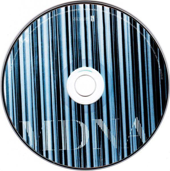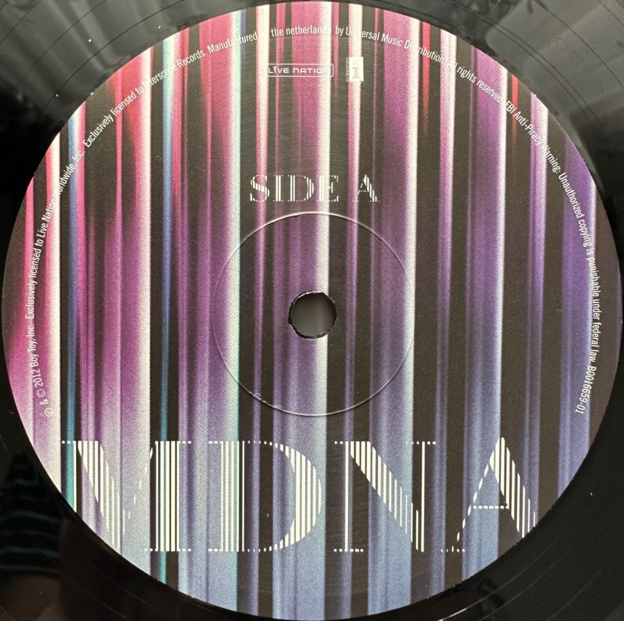 La tipografía es de estilo «Roman» y se juega con el mismo efecto de fragmentación o lineas en vertical a lo largo de las letras. La tapa solo nos presenta las siglas «MDNA», no hace falta agregar nada más. Esto nos remite un poco al primer disco de en donde sólo aparecía el nombre «Madonna», solo que esta vez, optamos por las iniciales.