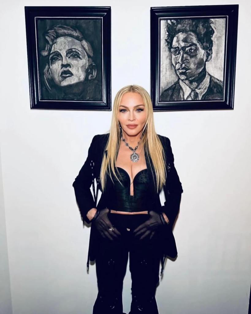 Gave good face: Madonna posando junto a un retrato realizado por su hijo inspirado en su icónico look del video «Vogue».