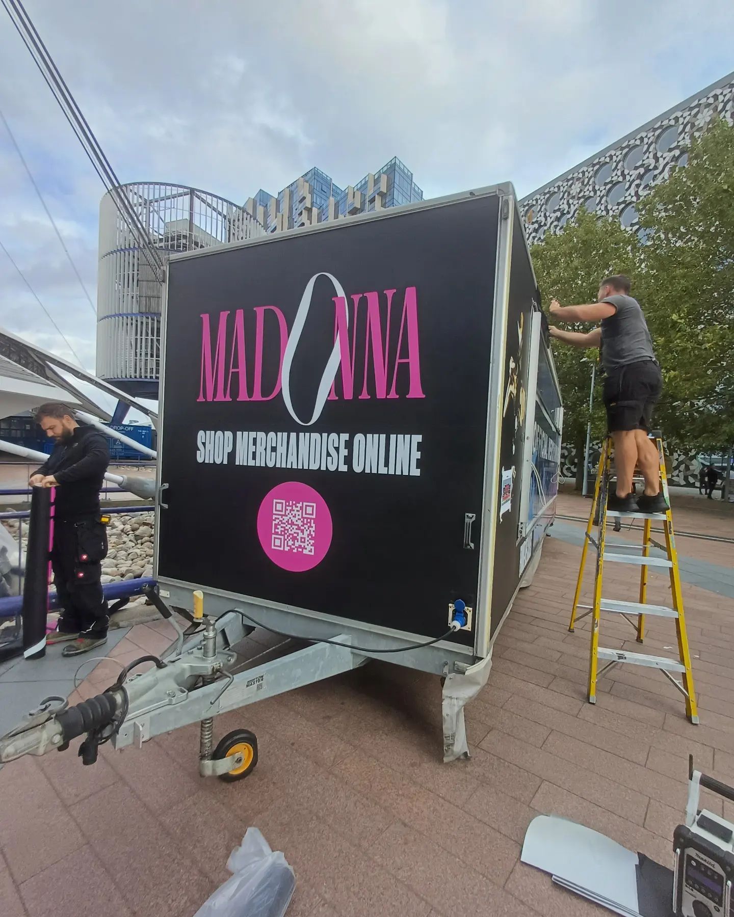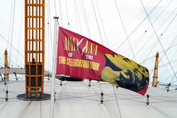 El estadio «O2» de Londres se preparó para recibir a Madonna con el inicio de su mega gira «The Celebration Tour». Podemos ver algunas de las banderas que adornarán el lugar durante los cincos días de shows; además de los carteles y afiches en la entrada del estadio. Se instaló una pop up store en la puerta del «O2» con la venta de todo el impresionante merchandising de la gira.