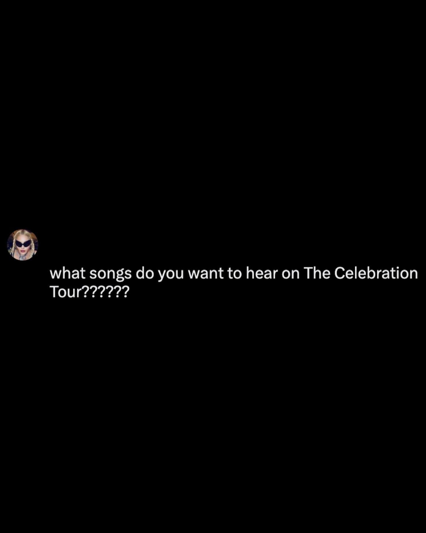 Luego de varios meses de un ensayo intenso, Madonna y todo su grupo comienzan los últimos tramos de preparativos antes del lanzamiento de la gira em Londres. En un posteo en Instagram, Madonna ha subido algunas fotos con la leyenda: «¿Qué canciones les gustaría oir?». «The Celebration Tour» se espera sea una de las giras más impresionantes, caras y producidas de toda la carrera de Madonna. Estamos ansiosos por el inicio del tour!