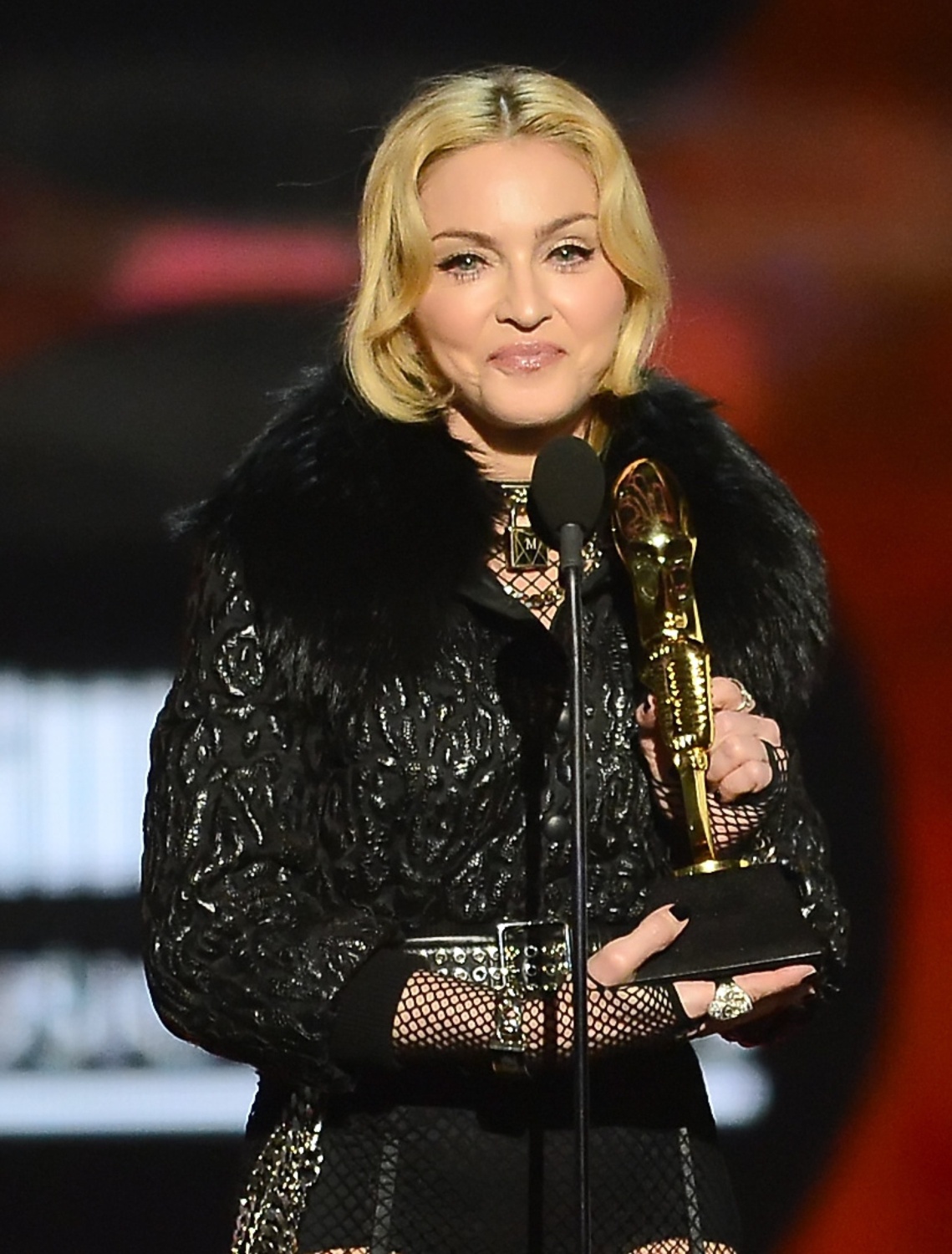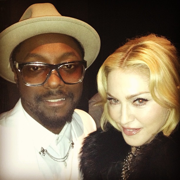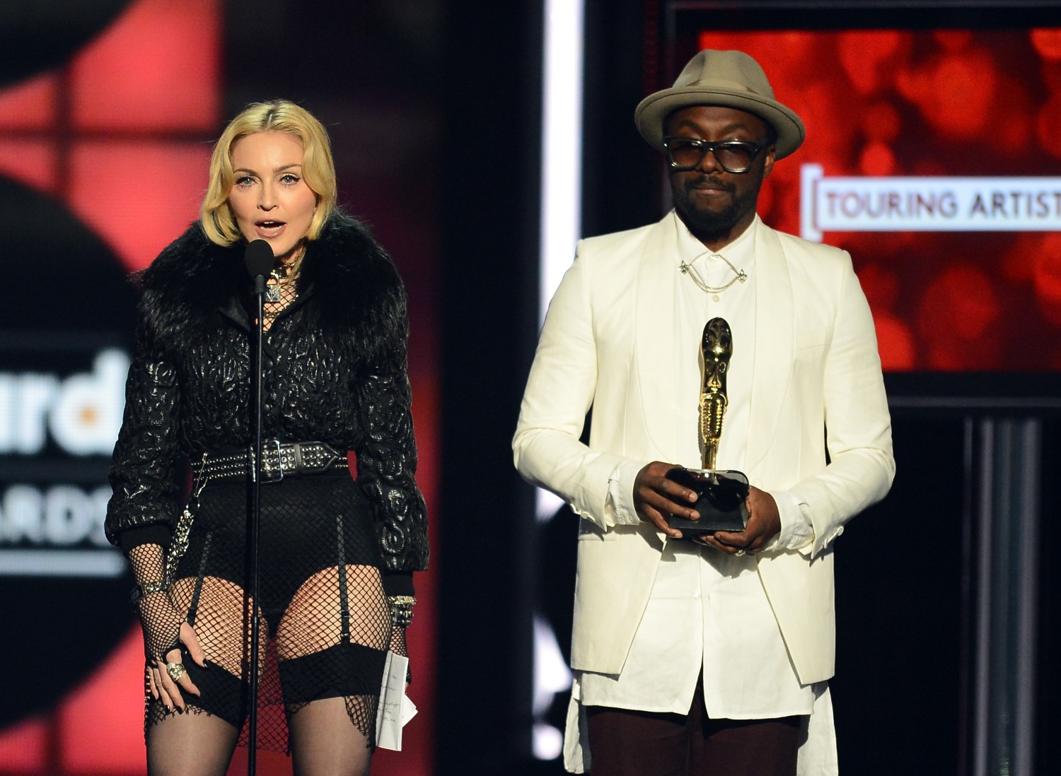 El rapero Will.i.am fue el encargado de presentar a Madonna para la categoría «Top Touring Artist» en donde estuvo nominada junto a Lady Gaga, Bruce Springsteen, Coldplay y Rodgers Waters. El cantante comenzó diciendo: «Muchos me preguntan cuál es mi canción de Madonna preferida… y yo siempre respondo lo mismo… mi canción favorita es ‘Like a Virgin'». Luego de mencionar todos los récords y las cifras de ventas de Madonna no sólo con su última gira sino en su carrera en general, se proyectó un breve video que resumía lo mejor del «MDNA Tour» para luego dar ingreso a Madonna quien sorprendió con un jugado y atrevido estilo: chaqueta de cuero labrado con cuello de piel estilo «bomber», camiseta de red que dejaba ver su mini short, medias de red con ligas y portaligas y altísimos zapatos de tacón todo en color negro y rematado por supuesto con sus infaltables gafas de sol.