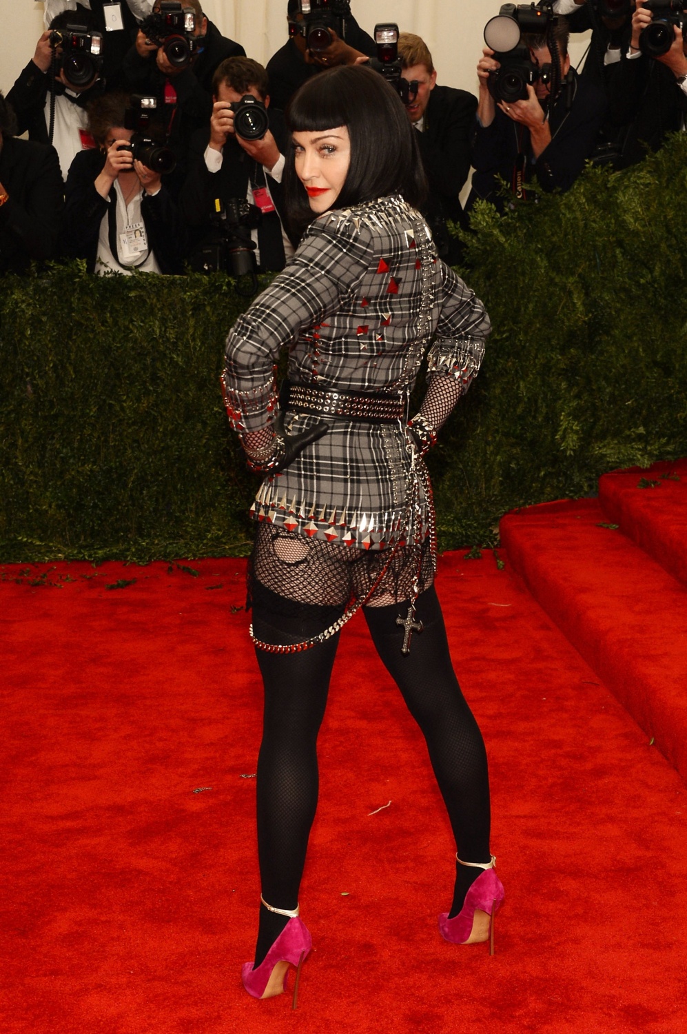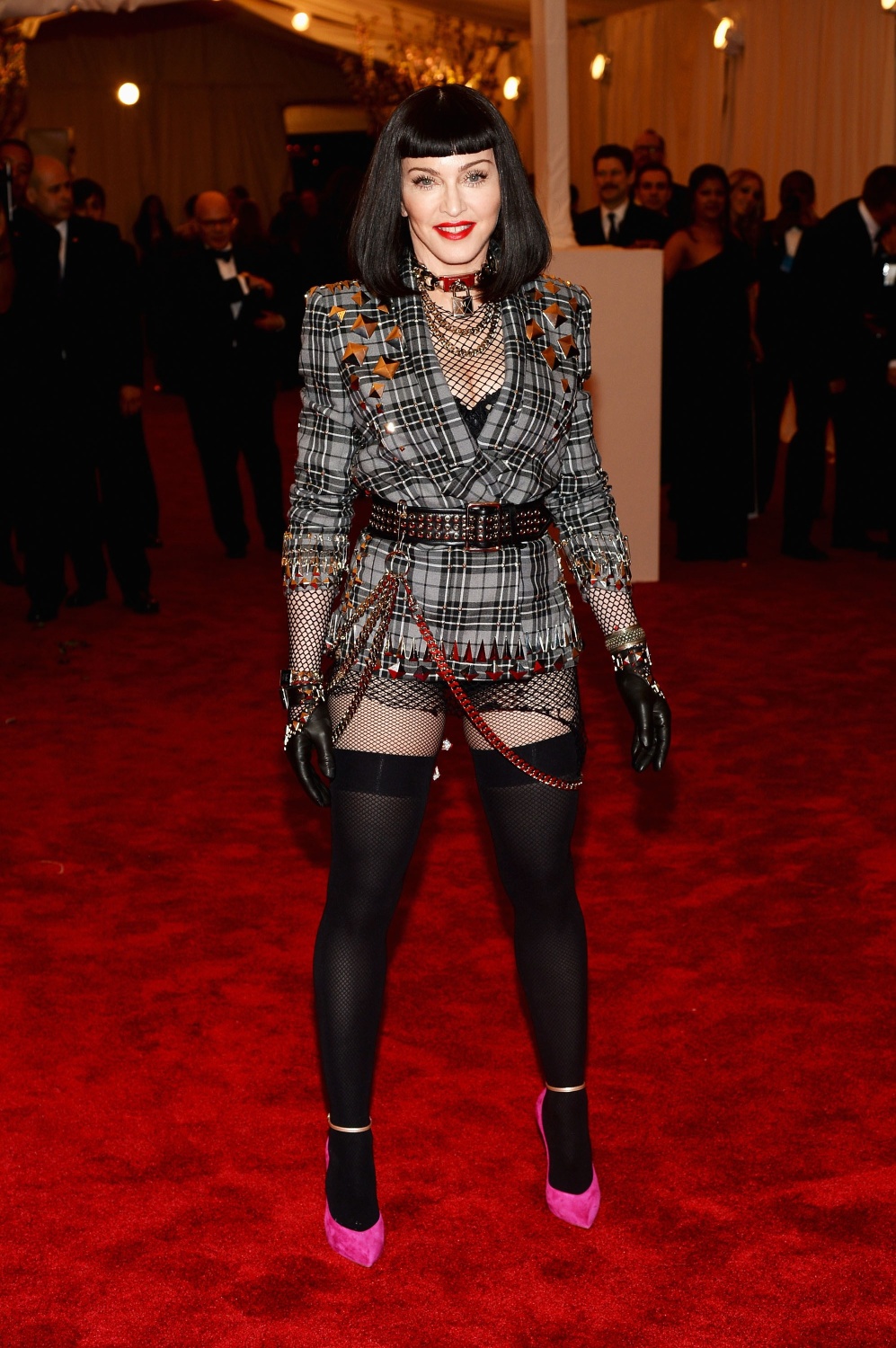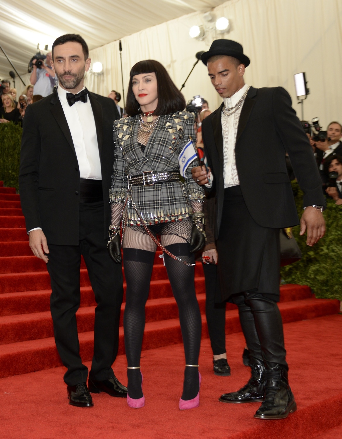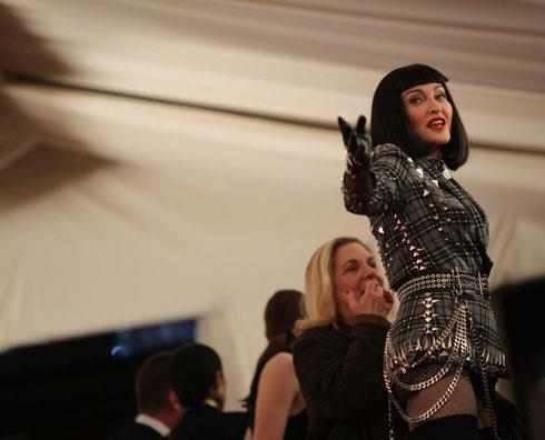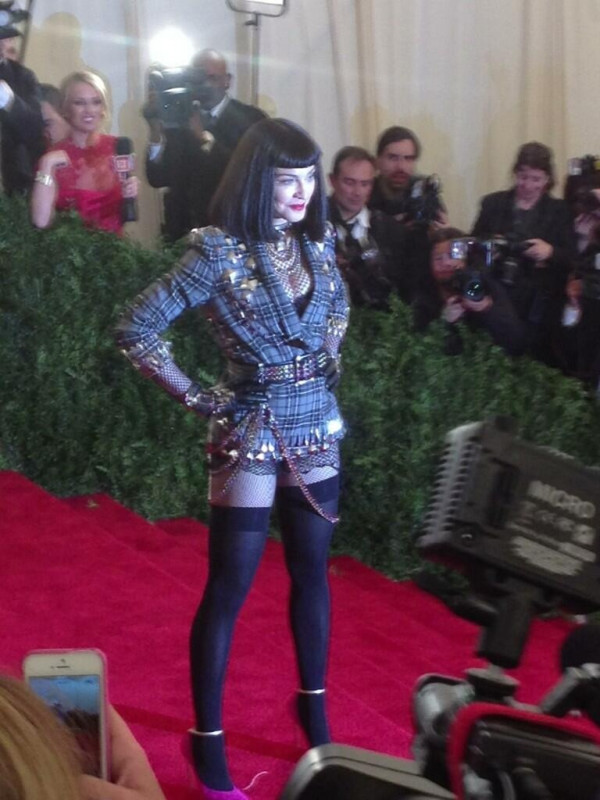 Madonna llegó al evento acompañada de su novio, Brahim Zaibat y de la mano del diseñador Ricardo Tisci. La diva ingresó a la alfombra roja luego del paso de Beyoncé con una explosión de flashes y gritos. Madonna hizo su aparición, vestida con una chaqueta de tartán de «Givenchy» con tachuelas, abrochada sobre un mono de rejilla, cinturón de cadenas, medias de red y zapatos de tacón en color fuscia y un accesorio destacado: una gargantilla con candado de gran tamaño grabada con la letra «M». Desde la cruz que colgaba de la parte posterior de su conjunto como una cola sacrílega hasta sus labios rojos brillantes Madonna mostró innumerables detalles, cada uno de los cuales elevó el conjunto a nuevas alturas de perfección punk rock.