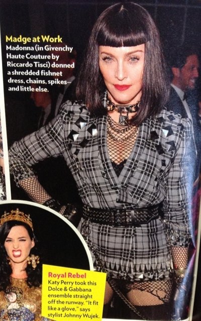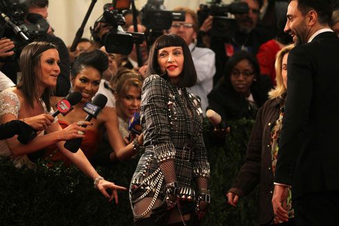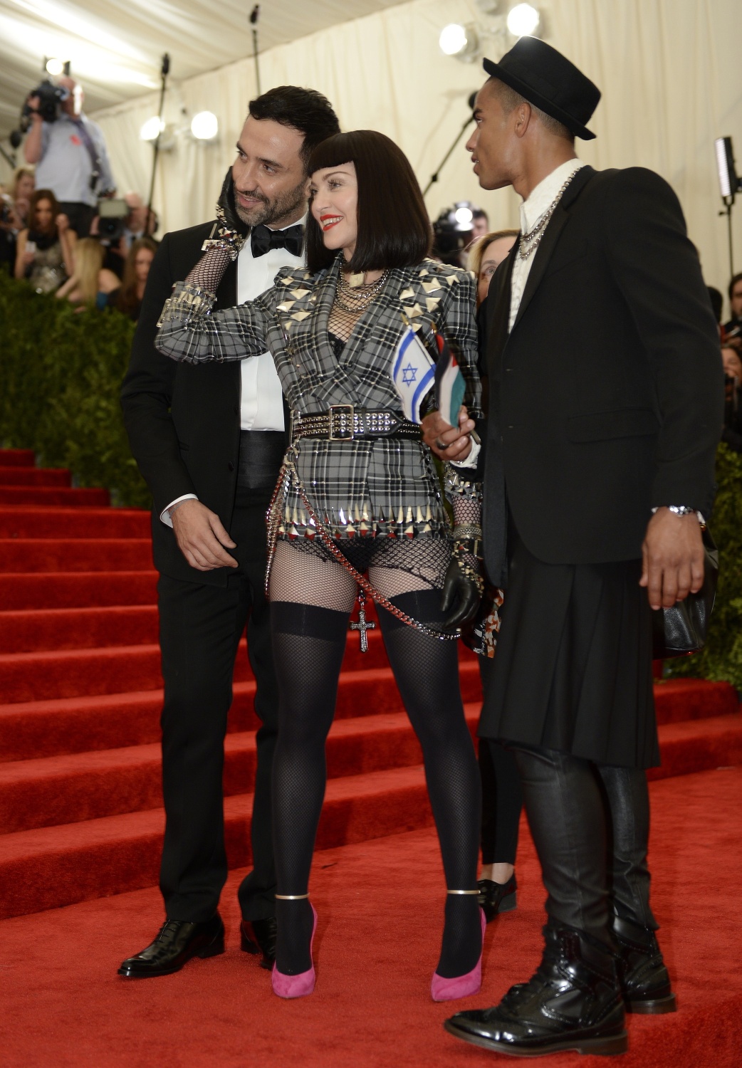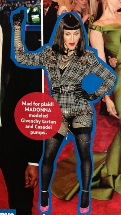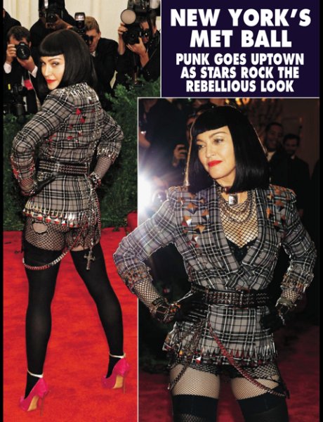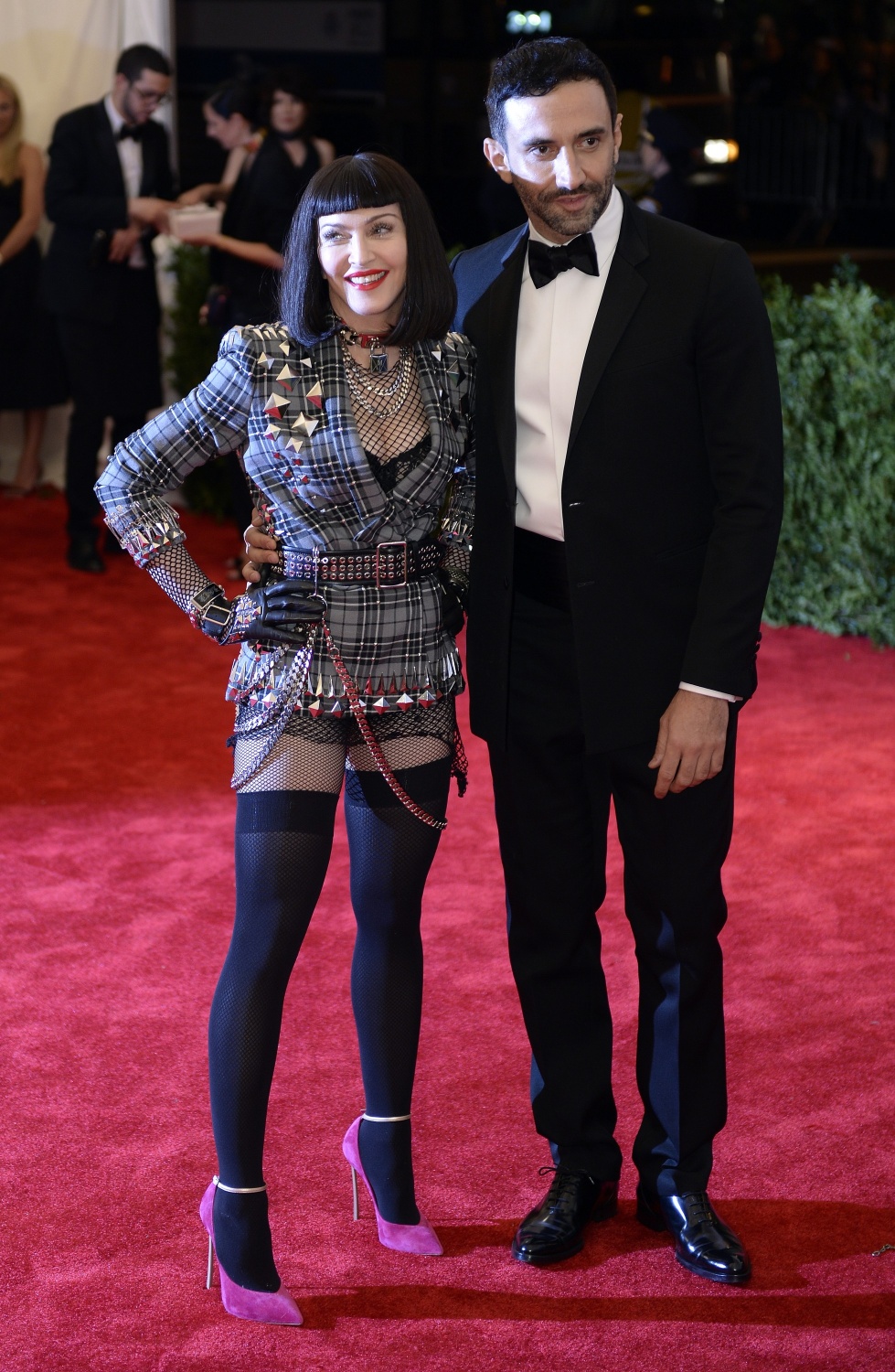 Madonna llegó al evento acompañada de su novio, Brahim Zaibat y de la mano del diseñador Ricardo Tisci. La diva ingresó a la alfombra roja luego del paso de Beyoncé con una explosión de flashes y gritos. Madonna hizo su aparición, vestida con una chaqueta de tartán de «Givenchy» con tachuelas, abrochada sobre un mono de rejilla, cinturón de cadenas, medias de red y zapatos de tacón en color fuscia y un accesorio destacado: una gargantilla con candado de gran tamaño grabada con la letra «M». Desde la cruz que colgaba de la parte posterior de su conjunto como una cola sacrílega hasta sus labios rojos brillantes Madonna mostró innumerables detalles, cada uno de los cuales elevó el conjunto a nuevas alturas de perfección punk rock.