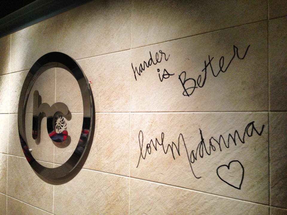 Madonna realizó un recorrido por las instalaciones y se mostró muy entusiasmada con el estudio de fitness grupal que tiene una pista de baile flotante especial donde los miembros realizarán los programas de ejercicios exclusivos de la marca «Addicted to Sweat», que se basan en su rutina de ejercicios personal. Allí aprovechó para firmar un muro con su slogan: «Harder is Better».