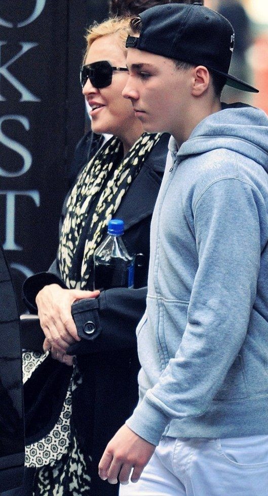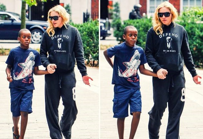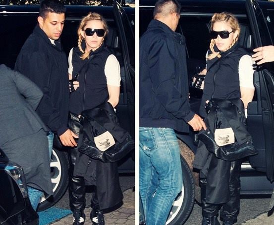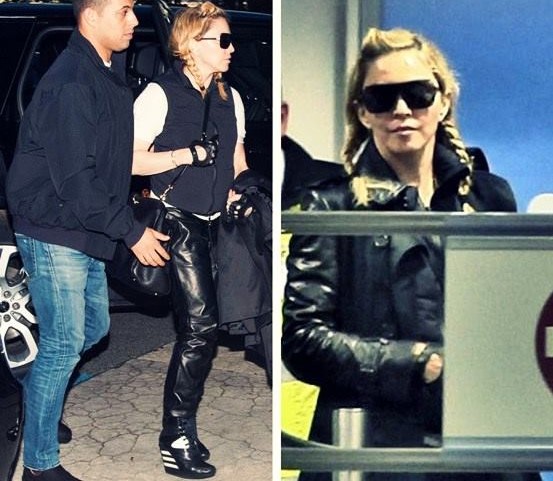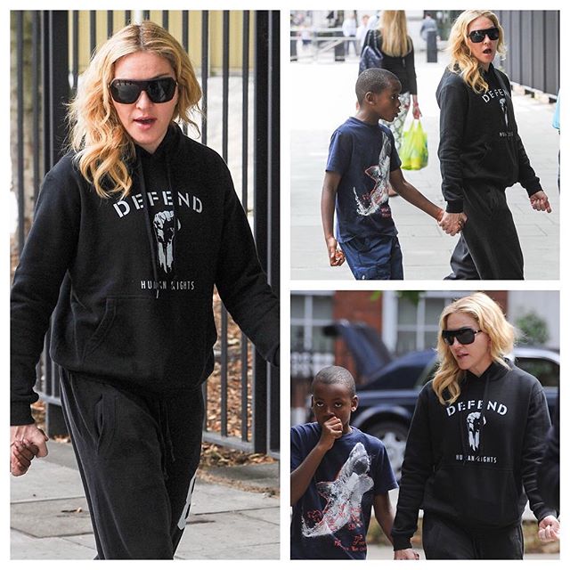 Madonna llegando a Londres en el «Aeropuerto Heathrow» y más abajo con su hijo David Banda, ella seguía haciendo promoción de la marca de ropa de su novio Brahim Zaibat, «Defend Paris».