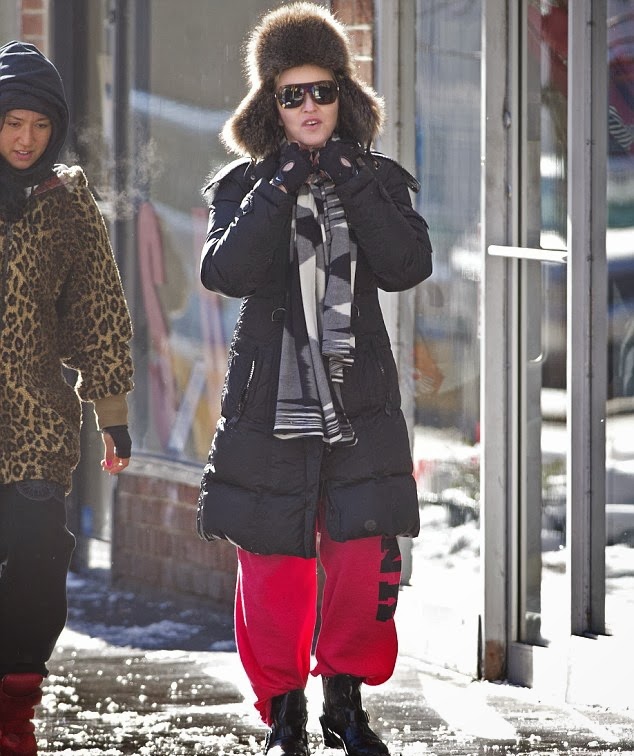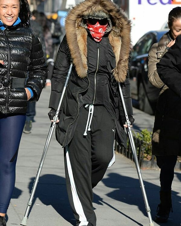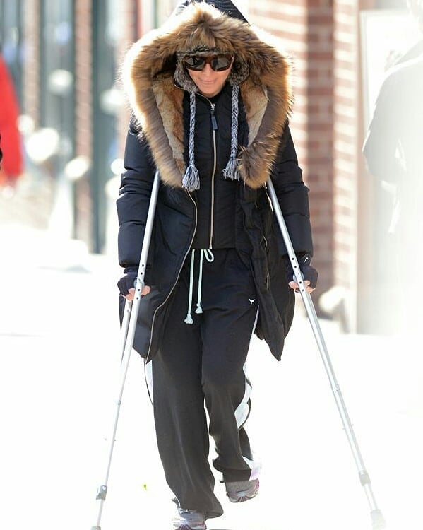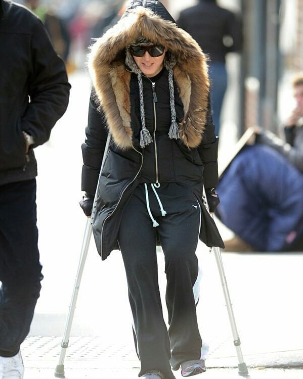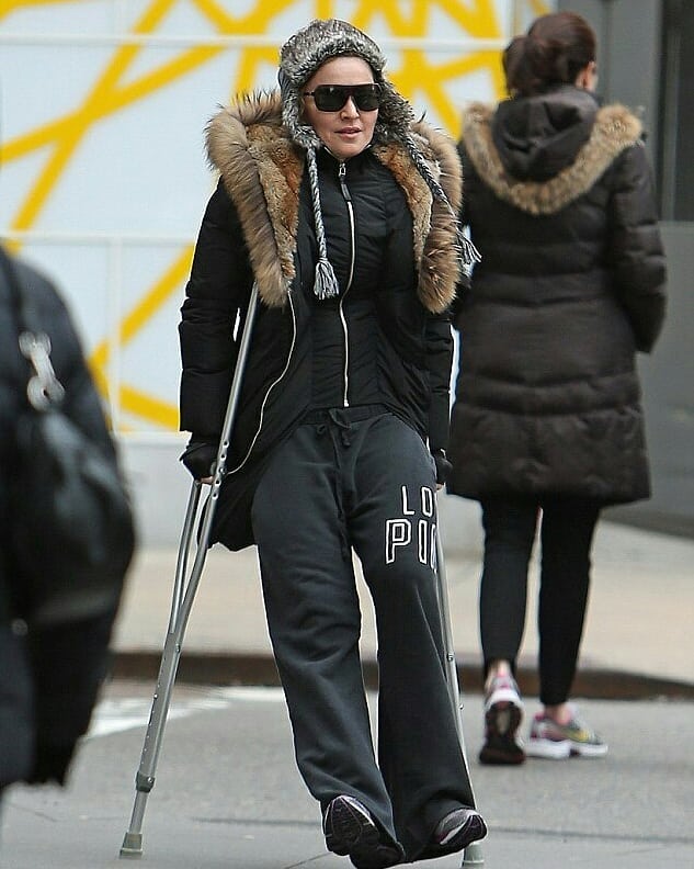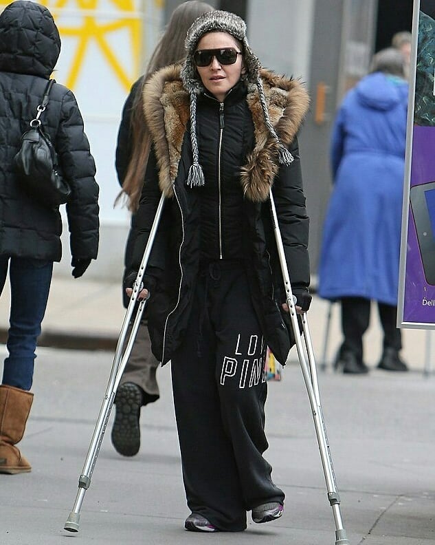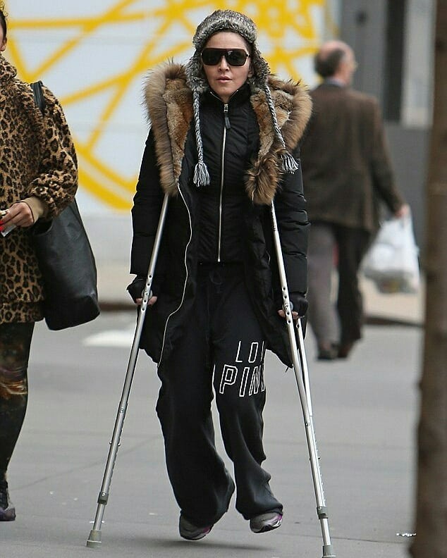 Madonna en el invierno de New York con muletas luego de su caída esquiando en los Alpes Suizos.