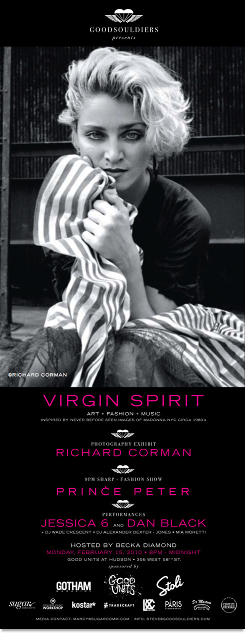 Por varios años, Matthew Rettemund (autor de «Enciclopedia Madonnica») controló el derecho de las exquisitas imágenes de Madonna obra de Richard Corman. Estos derechos, están ahora recuperados y en las manos de Corman nuevamente y el fotógrafo las mostró por primera vez en «Virgin spirit» («Espíritu Virgen») un show multimedial que incluía fotografías, música en vivo y desfile de modas. El evento se llevó a cabo el 15 de febrero de 2010 desde las 8 pm hasta las 12 am en el «Hudson Hotel». En parte desfile de modas, en parte concierto de rock, en parte exhibición de arte, «Virgin Spirit» es una celebración a los artistas emergentes y su creatividad. En este evento único se presentaba la colección de ropa de Prince Peter y actuaciones en vivo de Jessia 6 y Dan Black, las cuales estuvieron inspiradas en la sesión fotográfica que Richard Corman tomó a Madonna a principios de los 80s. Este evento especial debutó en la semana de la moda de New York y donó gran parte de su recaudación a las víctimas del terremoto de Haití.