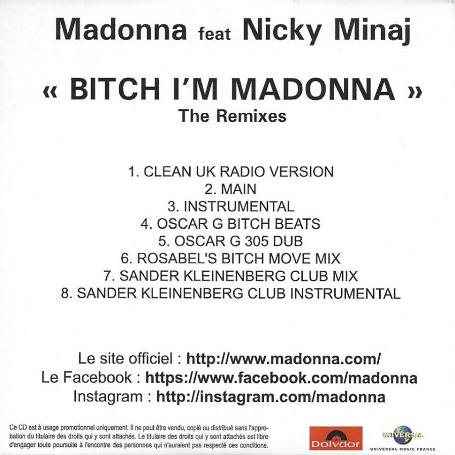 «Bitch I’m Madonna» no se editó de manera física. Solo se lanzó un CD promocional con remixes para ser distribuidos por las radios de USA. Solo Ucrania lanzó una edición especial limitada oficial únicamente para dicho país.
