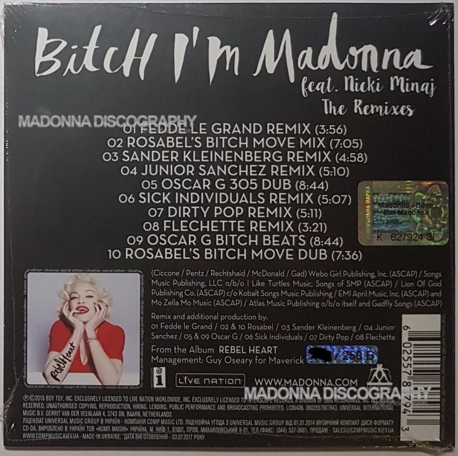- «Bitch I’m Madonna» fue el tercer y último single oficial del disco «Rebel Heart» lanzado a través de «Interscope Records» el 15 de junio de 2015. Este single no tuvo lanzamiento en formato físico de manera oficial.