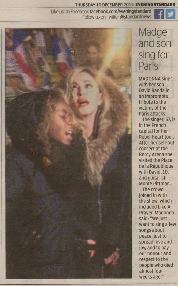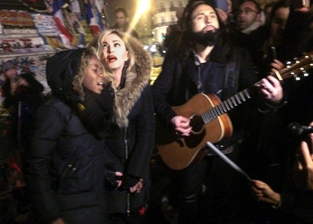 Una vez finalizado el show de su gira «The Rebel Heart Tour» en el «Paris Bercy» la noche del 10 de diciembre de 2015, Madonna decidió salir a las calles y realizar su propia protesta pacífica en contra de los atentados terroristas ocurridos en la capital francesa el 13 de noviembre. En su Twitter Madonna escribió: «estaré cantando algunas canciones en la Plaza de la República, encuentreme allí». Y así fue, ante la sorpresa y emoción de los transeúntes, Madonna acompañada de su hijo David Banda y su guitarrista Monte Pittman se ubicaron debajo del momento central (convertido ahora en altar para honrar a las víctimas) y se dispusieron a interpretar algunas canciones.