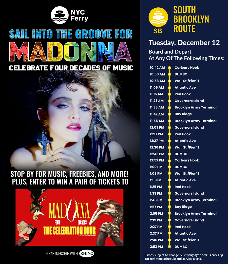 Por otro lado, el servicio de ferry de la ciudad de Nueva York se asoció con Warner Music Group para honrar el regreso de Madonna a la ciudad y también brindarles a los fanáticos la oportunidad de ganar boletos para la gira. Por lo que desde el 11 hasta el 17 de diciembre, la ruta del sur de Brooklyn se llamó «The Madonna Celebration Route» por lo que cada desembarco tenía el nombre en honor a Madonna. Así por ejemplo, Atlantic Ave/Brooklyn Bridge Park recibió el sobrenombre de «Celebration Ave», la cual era el acceso al «Barclays Center». También se contó con el «Express Yourself Hook», «Reinvention Hook», «Dancetería Rock», «Queen Mother Island», «Borderline Ridge» entre otros. También se organizó el evento «Sail Into The Groove for Madonna» a bordo de la ruta para salidas selectas con pase por música, obsequios oficiales de Madonna, rifas de premios de Madonna y tickets para los shows del «Madison Square Garden».