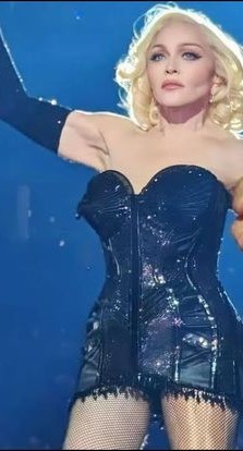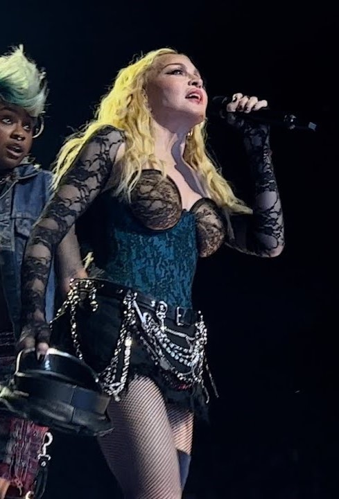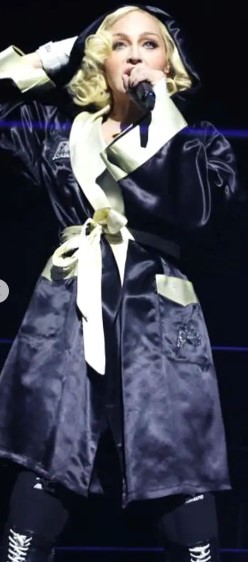 Uno de los mejores momentos de la gira llega hacia el final, cuando Madonna realiza una interpretación especial de «Bitch I’m Madonna». Todos los bailarines usan varios looks de su archivo, ya sea un look de alfombra roja o un look de portada de álbum. «Muchos de estos looks, [Madonna] todavía los tenía en sus archivos, así que fuimos a verlos y combinamos las telas y los bordados», dice Yohannes. Incluso el hijo de la superestrella, David, hace un cameo, vistiendo el abrigo de piel blanco, el sombrero de vaquero y la cadena de joyería Versace que Madonna lució en el video musical «Music» de 2000. Por su parte, Madonna salió luciendo un corset en color azul-turquesa armado con cordones, hebillas metálicas y ligas elásticas y detalles de encaje negro en busto, todo creado especialmente por «Rosamosario». Se completó el estilo con un velo de novie en tul blanco de la firma «Barragán» y botines cortos con broches en cuero negro de Olivier Theyskens. Este estilo se inspiró en el que Madonna lució durante los «MTV VMAs» de 2018.