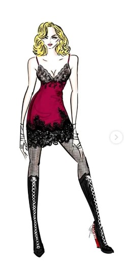 Luego, se muestra un vestido corto en seda roja con detalles en encaje negro en busto y falta, esto podría llevarnos hacia la época de «Erotica» o porqué no hacia «Bedtime Stories».