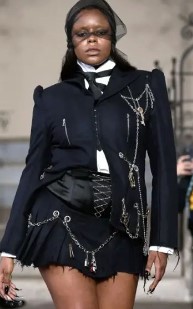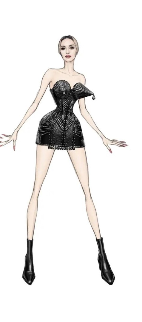 Debajo del saco, Madonna deslumbró con un corset con busto en cono de seda negro con incrustaciones de millones de cristales, piedras y lentejuelas negras. «No sería un espectáculo sin Gaultier», afirma Melssen. “Él simplemente conoce su cuerpo y cómo quiere sentirse. [Madonna] no podría imaginarse hacer esto sin [él]”. Se completó el estilo con guantes de largos con bordados de cristales de Sol Angel.