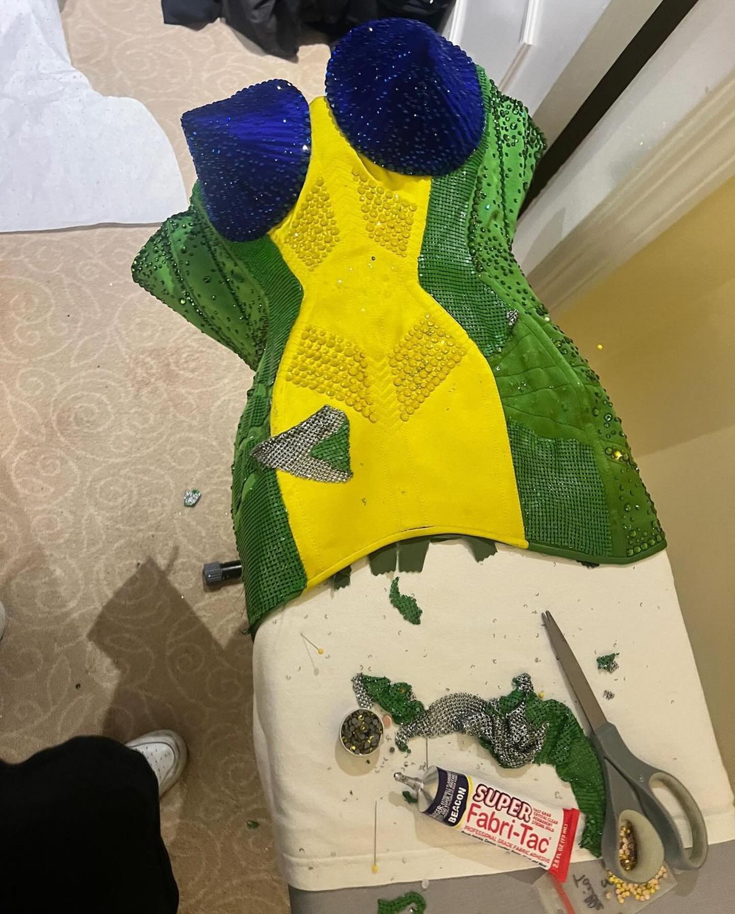 Un grupo de modistos y costureras instalados en el hotel «Copacabana Palace» trabajaron incansablemente durante una semana para la realización de este nuevo outfit.
