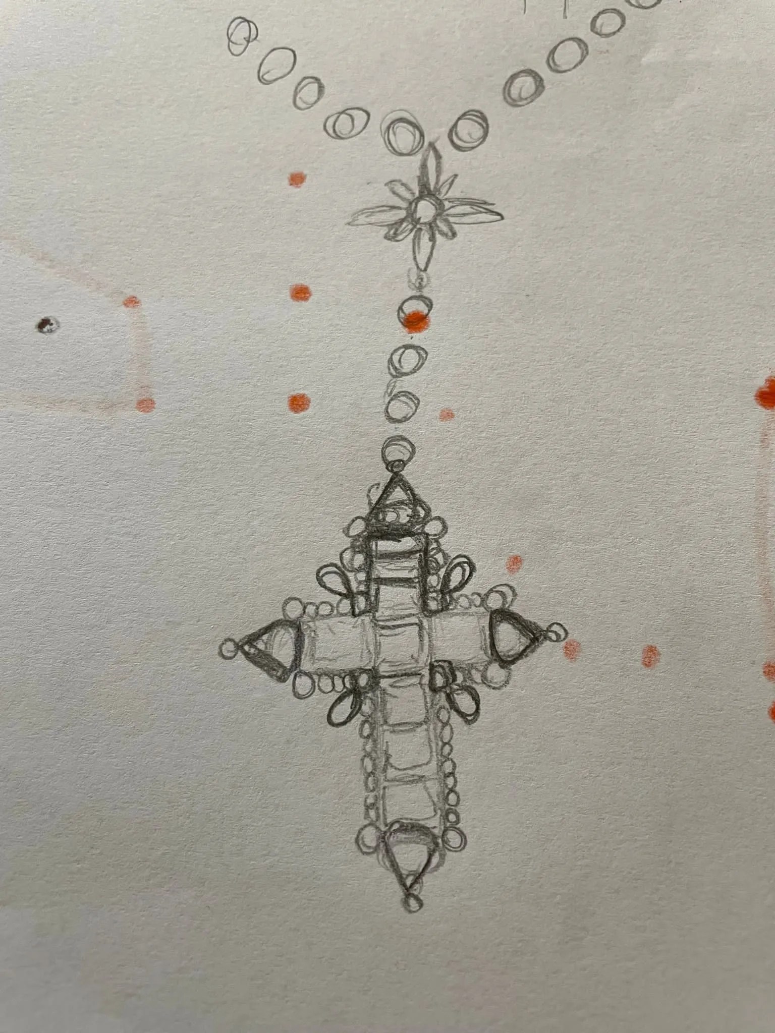 Otro accesorio utilizado en este gran final fue un rosario en plata y cristales con cruz gótica realizado especialmente por Marta Oriani creadora de la firma «Almarow». «Pensé en joyas reales, que son parte de la estética de Almarow, en particular las cruces victorianas elaboradamente adornadas que parecían perfectas para Madonna», dice Oriani, que sólo tuvo dos semanas para producirlas. “¡Literalmente lo dibujé en la parte posterior de uno de los cuadernos de ejercicios de mis hijos!” dice Oriani. El taller de «Almarow» en Italia utilizó una combinación de formas de cristal (pera, marquesa, redonda y cuadrada) para acentuar la inspiración victoriana y darle un toque contemporáneo. «Decidí llamarla Vogue Cross», ya que ‘Vogue’ es una de mis canciones favoritas» comentó la diseñadora.