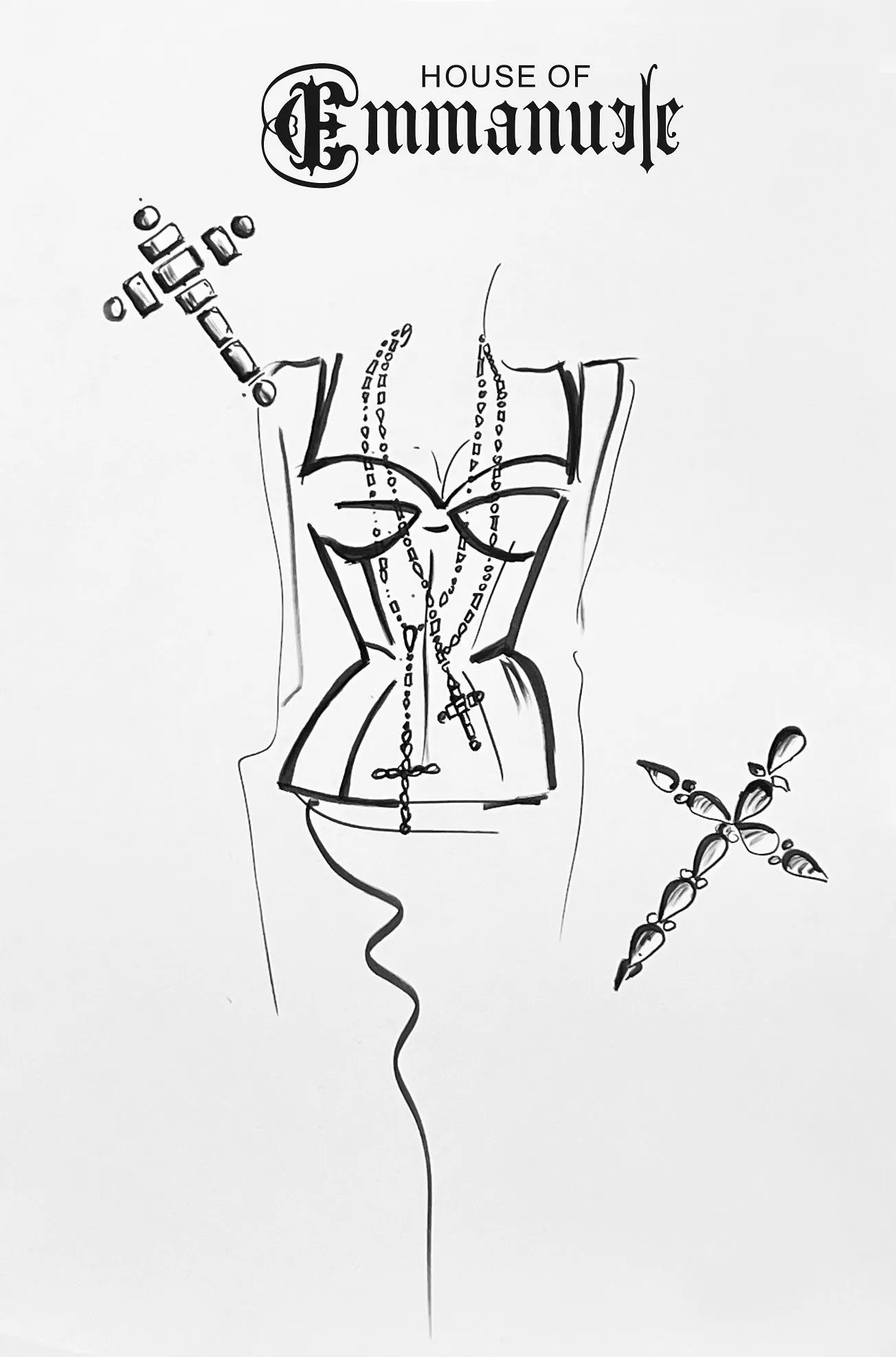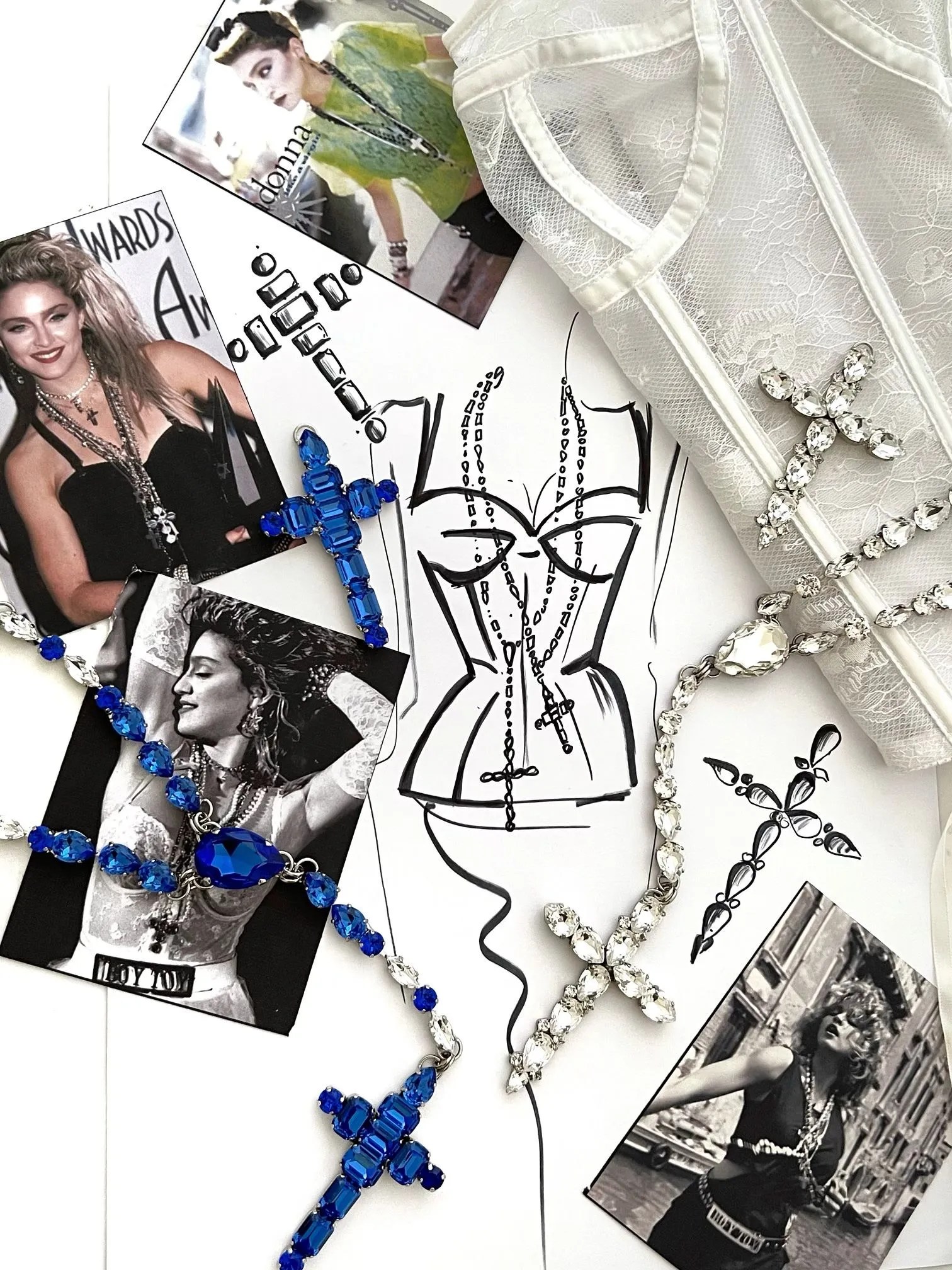 También usó un par de rosarios de la colección «La Croix Dynasty» realizados en cristal con una mezcla de piedras preciosas de colores en varios cortes, lo que da como resultado una reinterpretación moderna de la estética icónica de Madonna de los años 80. “Diseñar para el último Celebration Tour de Madonna fue un viaje que me llevó a mis primeros recuerdos de Madonna: un momento en el que ella encarnó perfectamente a su homónimo en el icónico video musical ‘Like A Virgin’”, dice Emmanuel Tsakiris la firma «House of Emmanuele». Estas piezas estuvieron inspiradas en el video «Like a Virgin» de 1984, y Tsakiris continuó: “ver a Madonna usar estos crucifijos en el escenario no es sólo un momento culminante de mi carrera, sino también una manifestación surrealista de los sueños que he estado gestando desde que tenía seis años con los ojos muy abiertos, cuando compré mi primer sencillo de Madonna y caí de cabeza en Mi obsesion.»