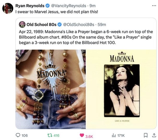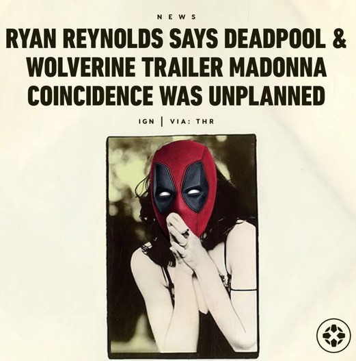 Como curiosidad, el 22 de julio día del estreno oficial del trailer del film que incluía la canción, fue también el mismo día pero de 1989 cuando el disco «Like a Prayer» llegaba al puesto N°01 del Billboard HOT200 para permanecer allí durante 6 semanas y también el single alcanzaba el puesto N°01 del Billboard HOT100 en donde estaría por 3 semanas. Según el protagonista del film, Ryan Reynolds que el lanzamiento del trailer sucediera justo este día fue una gran coincidiencia. En sus redes sociales, el actor comentó: «juro por Marvel Jesus que esto no fue planeado».