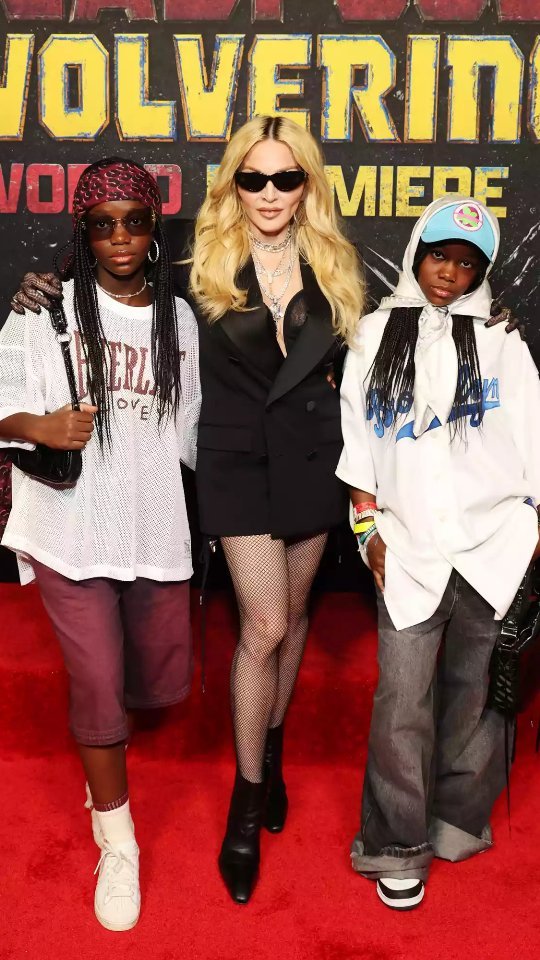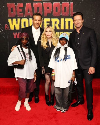 Madonna asistió al estreno de la película «‘Deadpool & Wolverine» con sus gemelas Stella y Estere y posó con los protagonistas de la película, Hugh Jackman y Ryan Reynolds, y el director, Shawn Levy. El estreno tuvo lugar anoche en la ciudad de Nueva York.